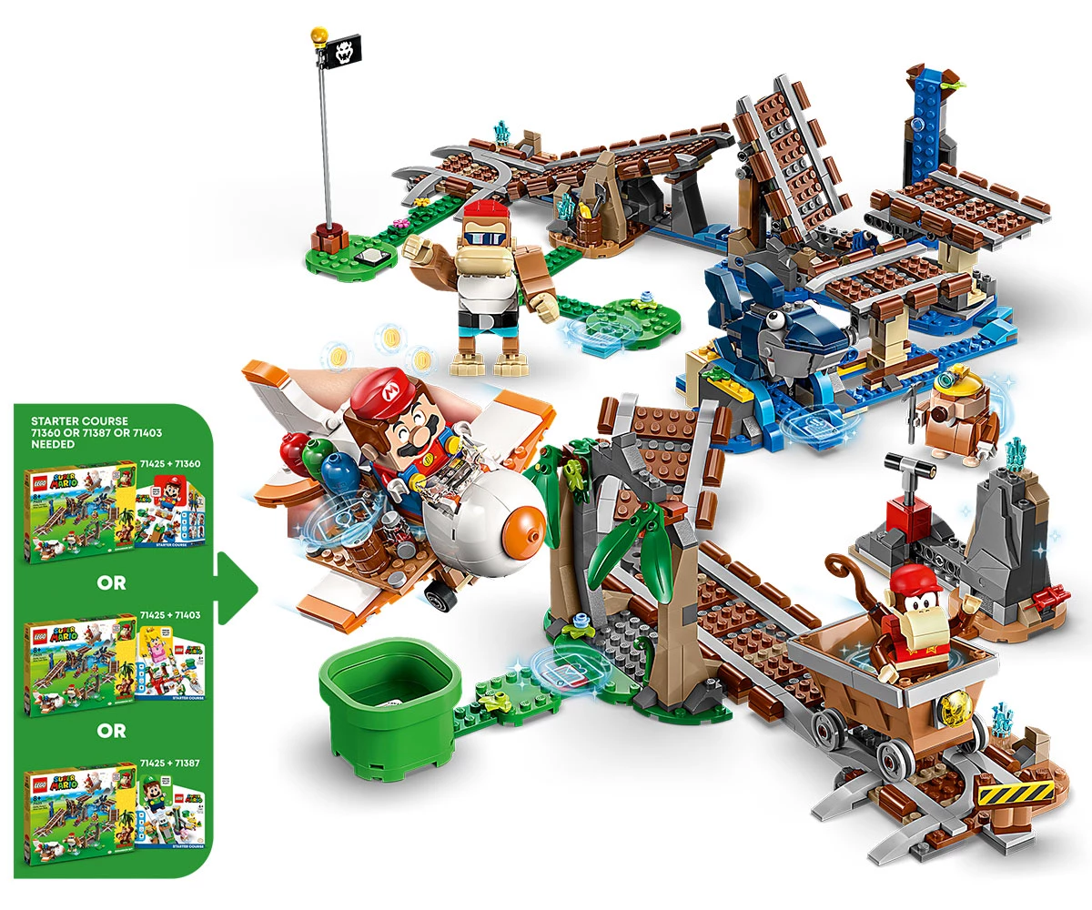 Комплект с допълнения Diddy Kong's Mine Cart Ride (71425) – пресъздайте предизвикателства с количката на Donkey Kong™, летене със самолет и взривяване на скали с комплекта LEGO® Super Mario™ за деца;