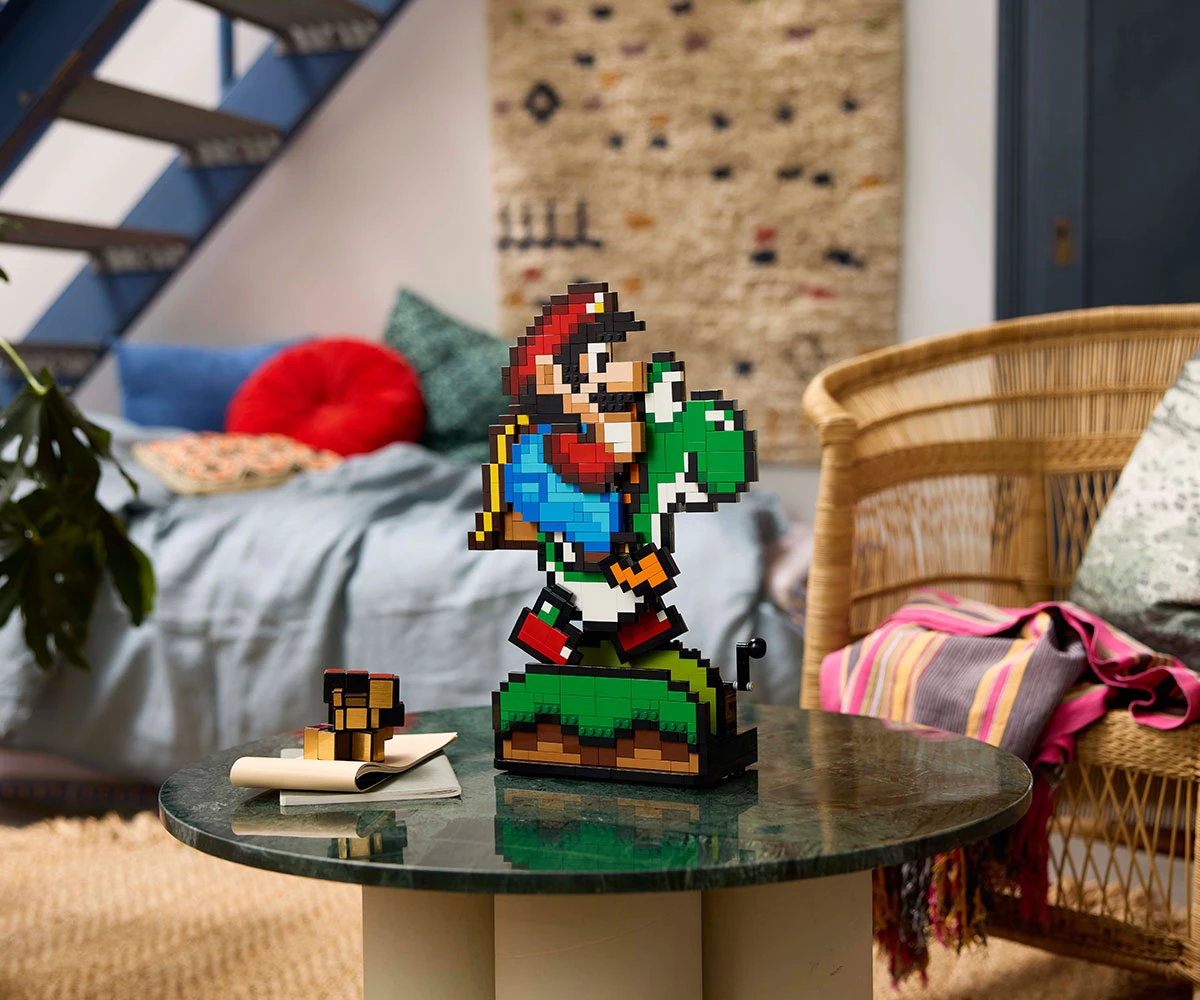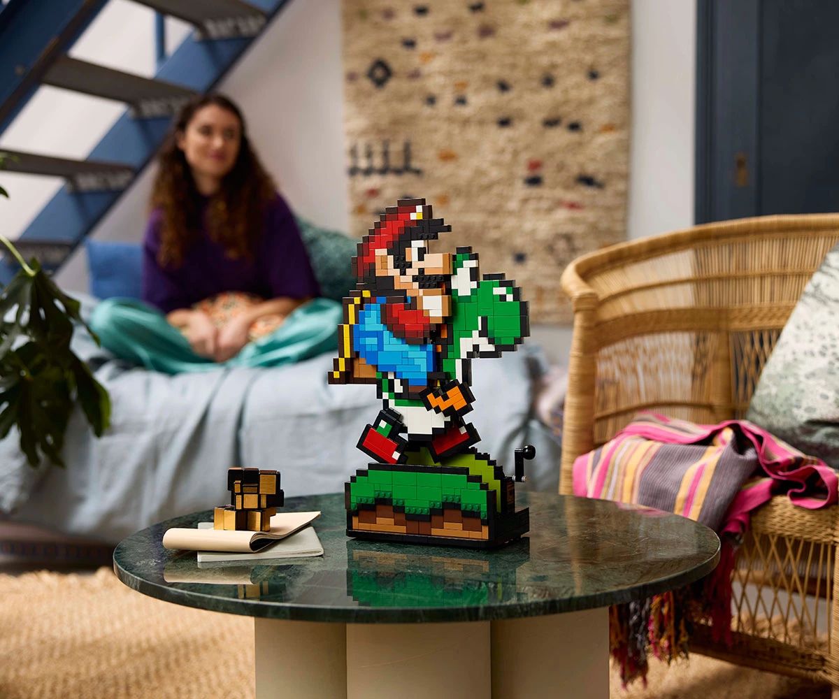 Пикселизирани фигури Nintendo® – завъртете дръжката в основата на модела, за да накарате Yoshi да тича с Mario на гърба си, и врътнете диска зад главата на Yoshi, за да накарате езика му да изскача навън;
