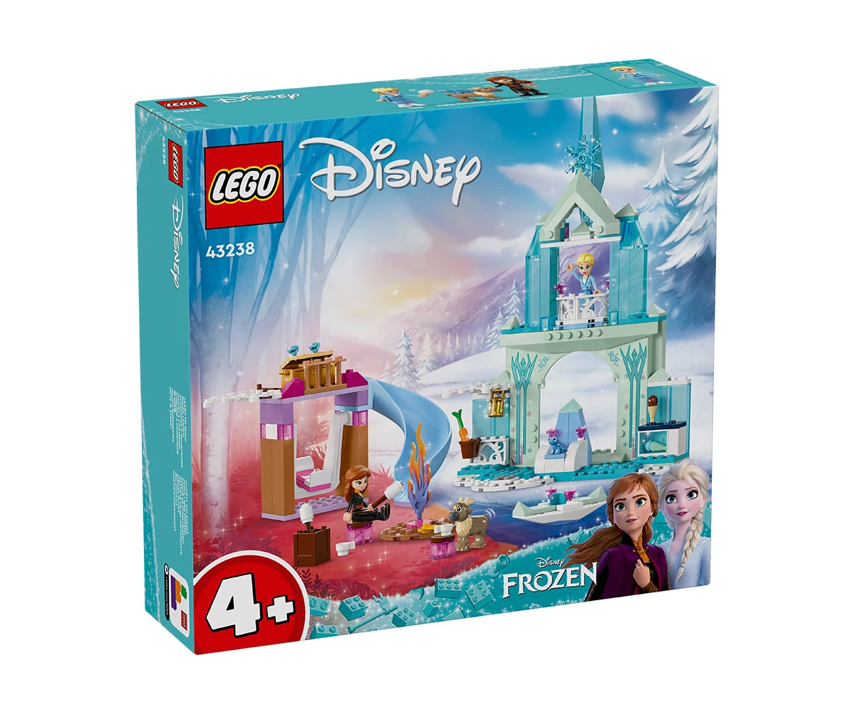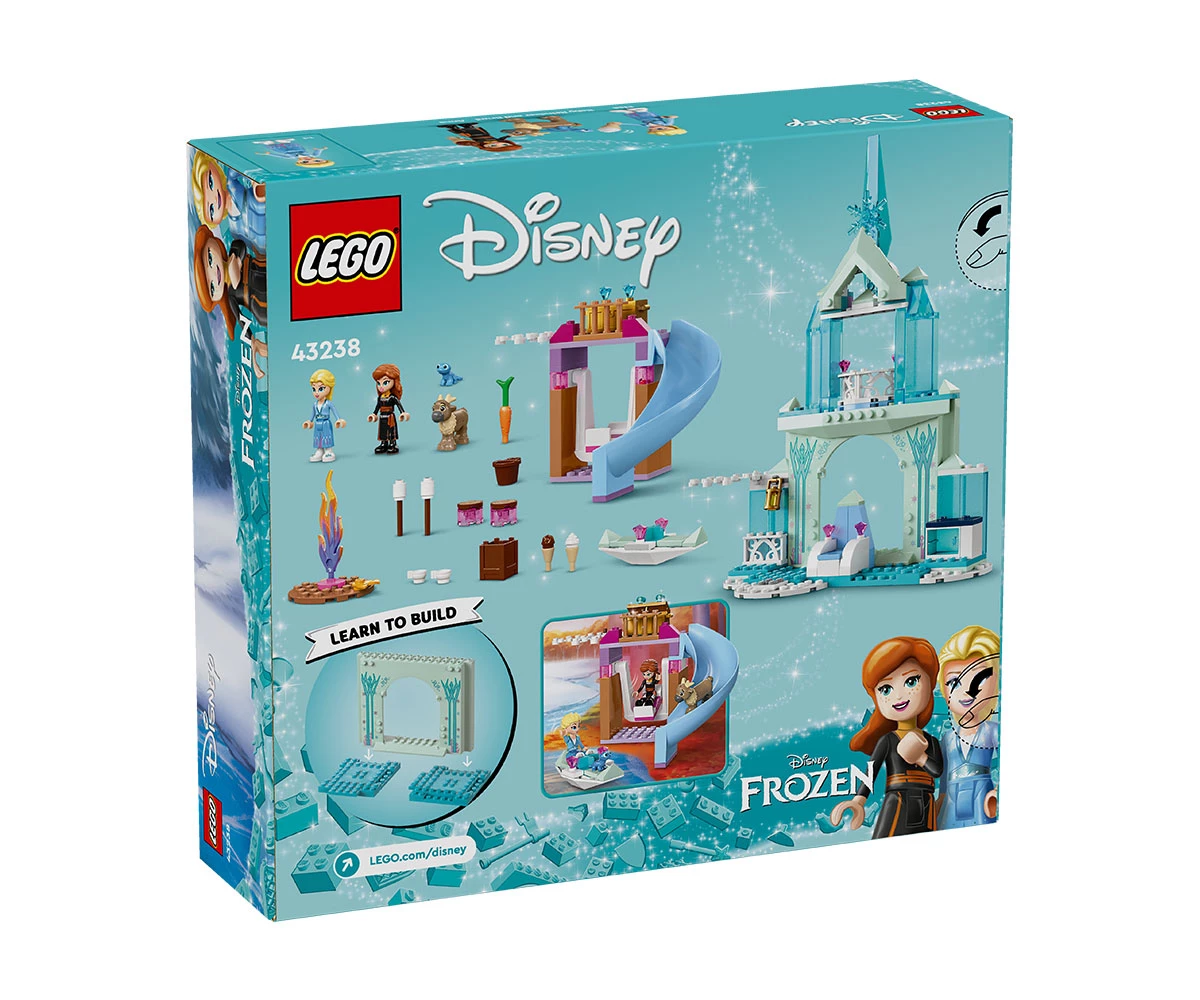 Комплект за конструиране и игра със замък – комплектът за конструиране Disney Frozen има замък, вдъхновен от Замръзналото кралство, фигури миникукла на Елза и Анна от LEGO® ǀ Disney и 2 фигури на животните Бруни и бебе еленче от LEGO ǀ Disney;