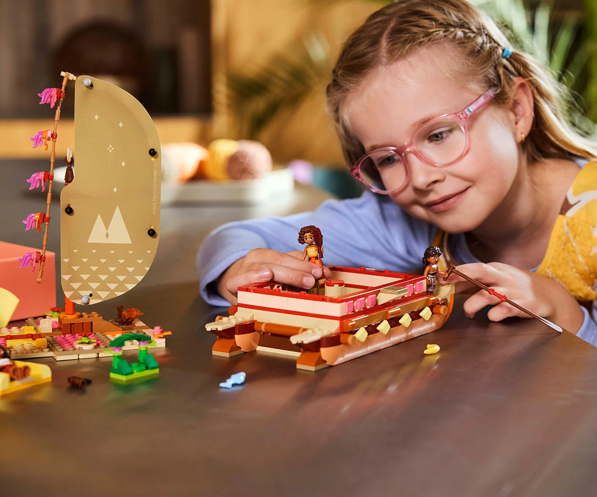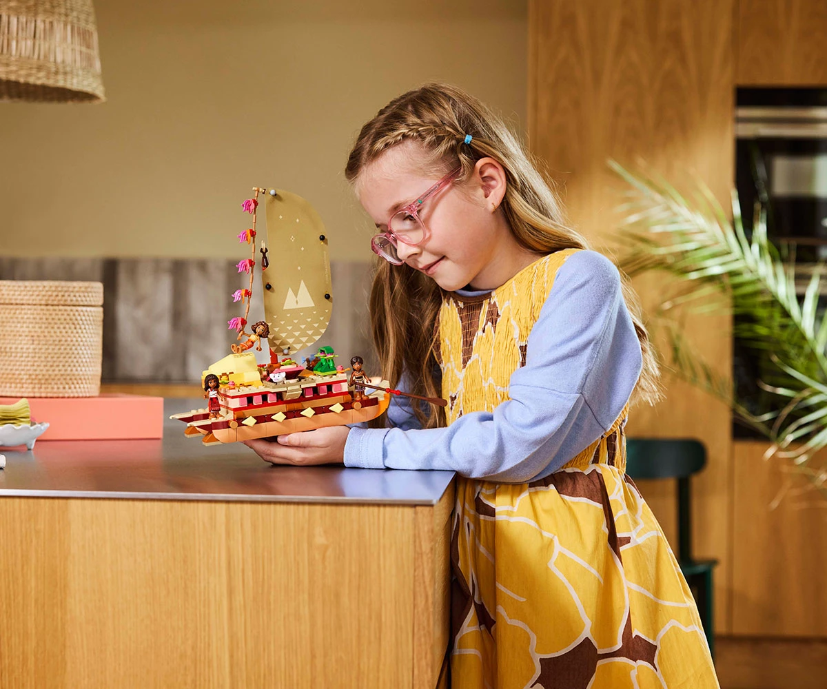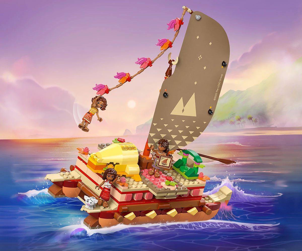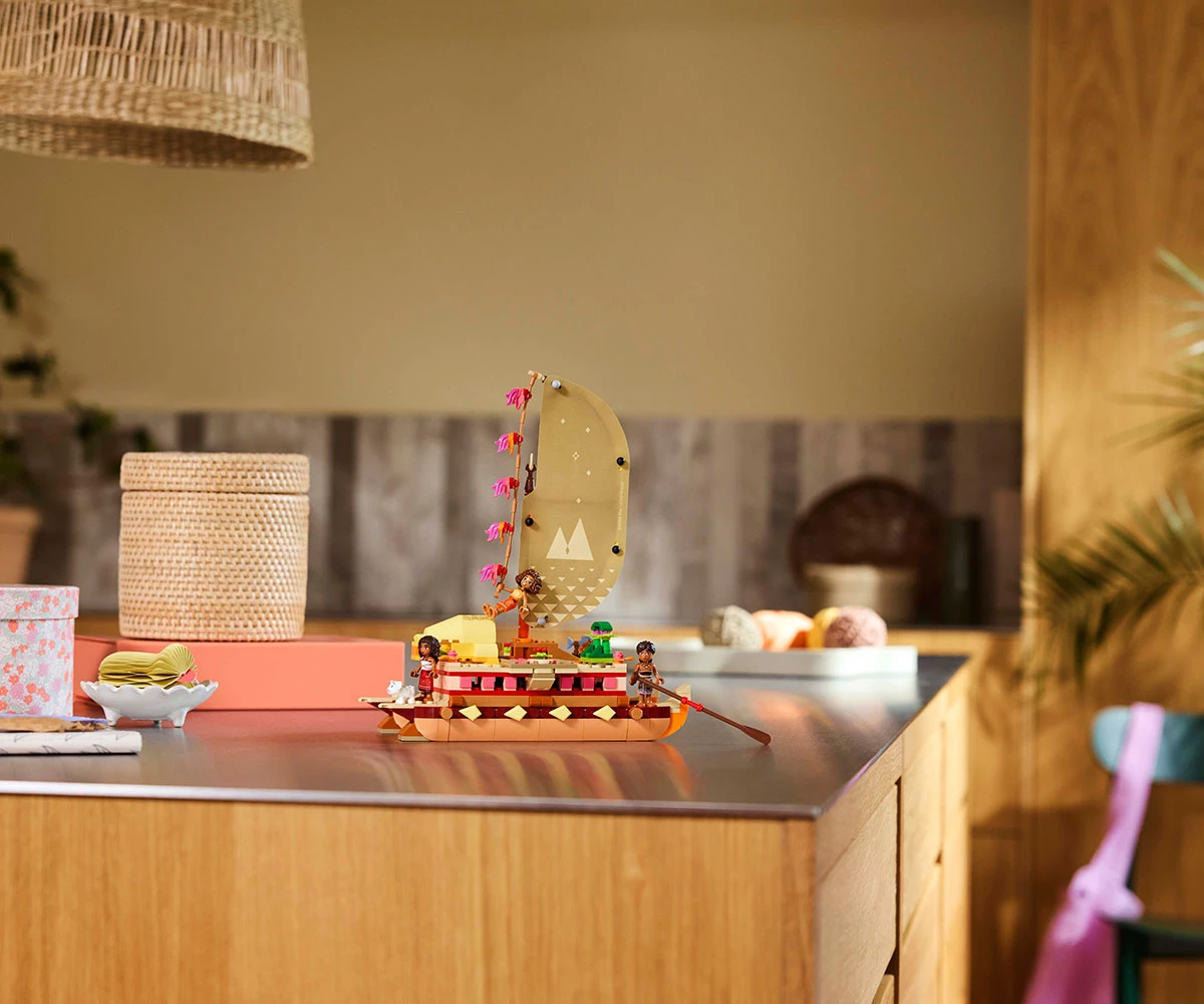 Комплект с модел – включва двукорпусно кану за конструиране с текстилно платно, подвижна палуба и жилищна зона под палубата, плюс четирима филмови герои на LEGO® ǀ Disney и много детайли;