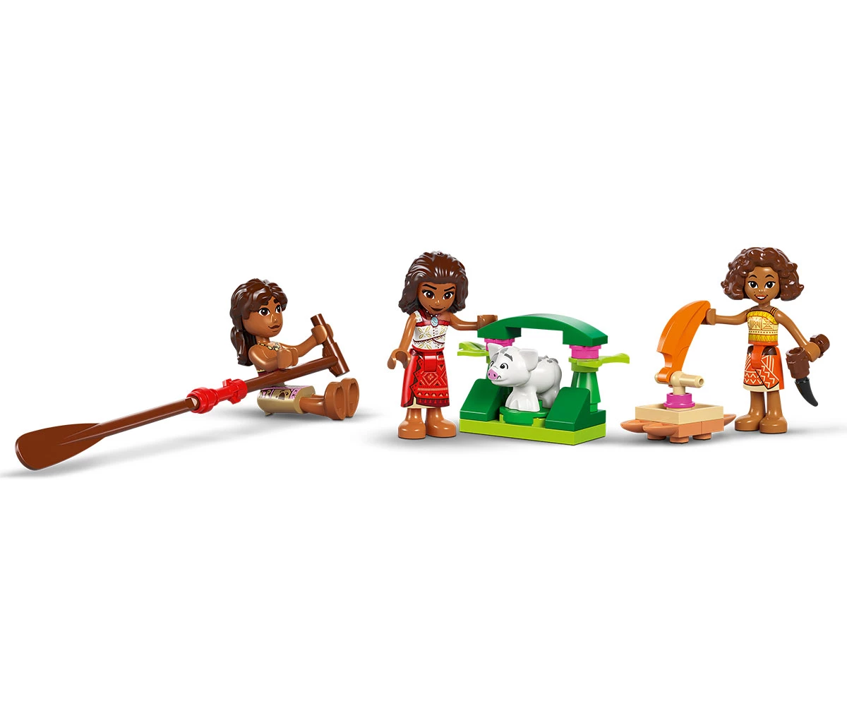 Комплект за игра Disney – двукорпусното кану за построяване има шарено текстилно платно с гирлянда лей хулу за намиране на посоката на вятъра, плюс къщурка за прасето Пуа, навес за Ваяна и други;