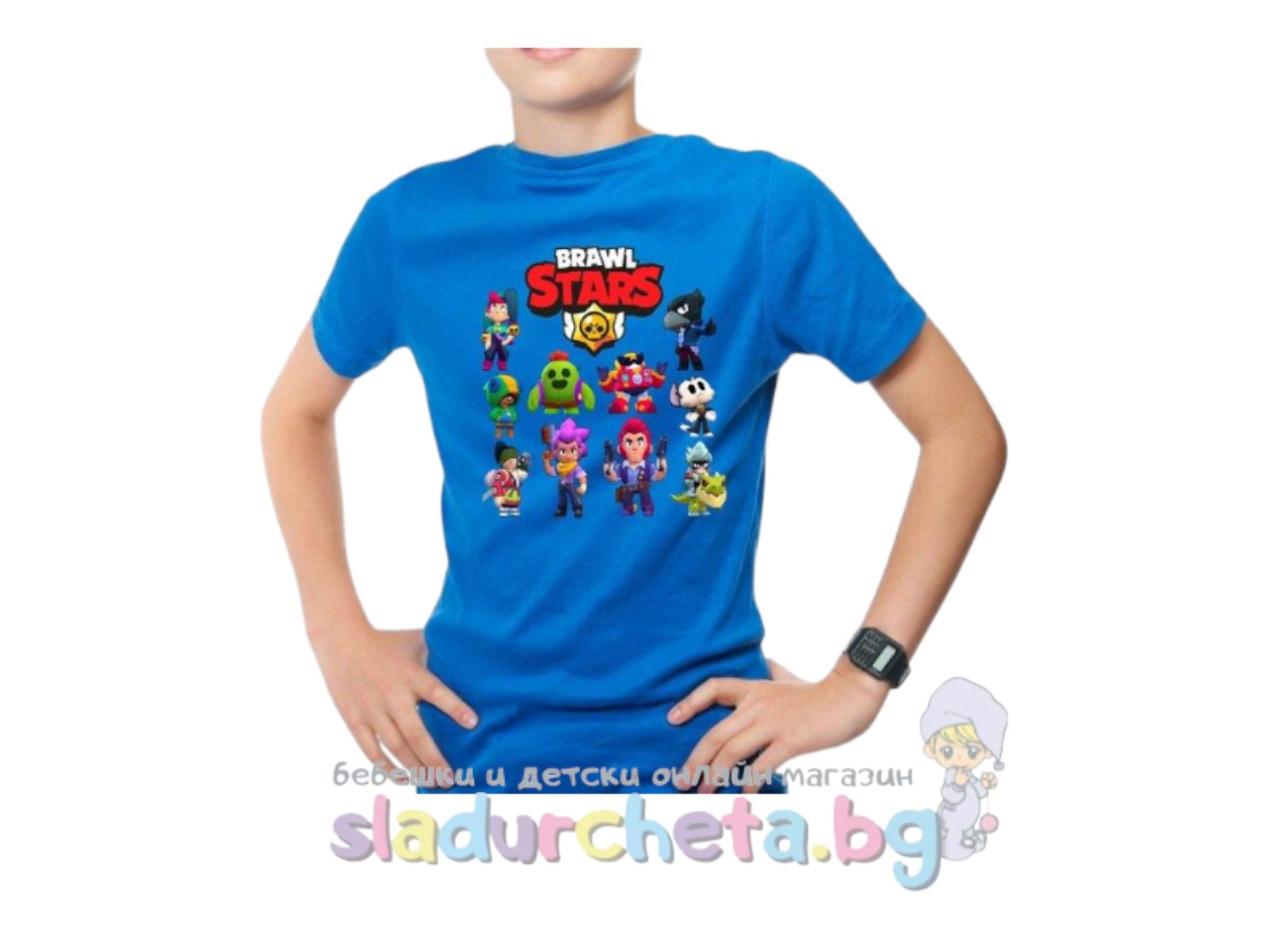 Тениската е с къс ръкав в син цвят с цветна апликация;