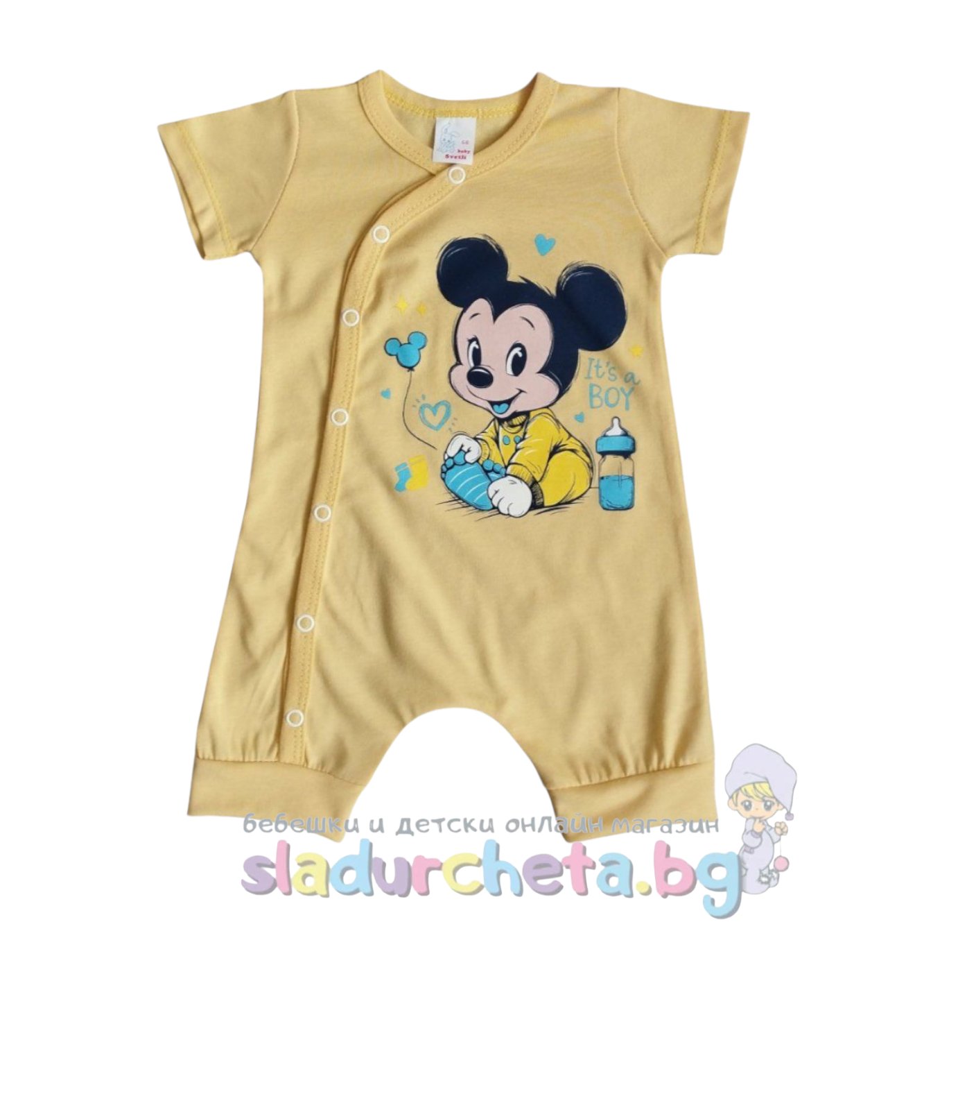 Гащеризонът е с къс ръкав в жълт цвят с цветна апликация на Мики Маус;