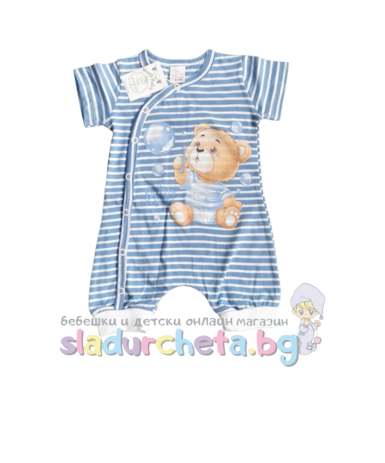 Гащеризонът е с къс ръкав на сини и бели райета с цветна апликация на мече;