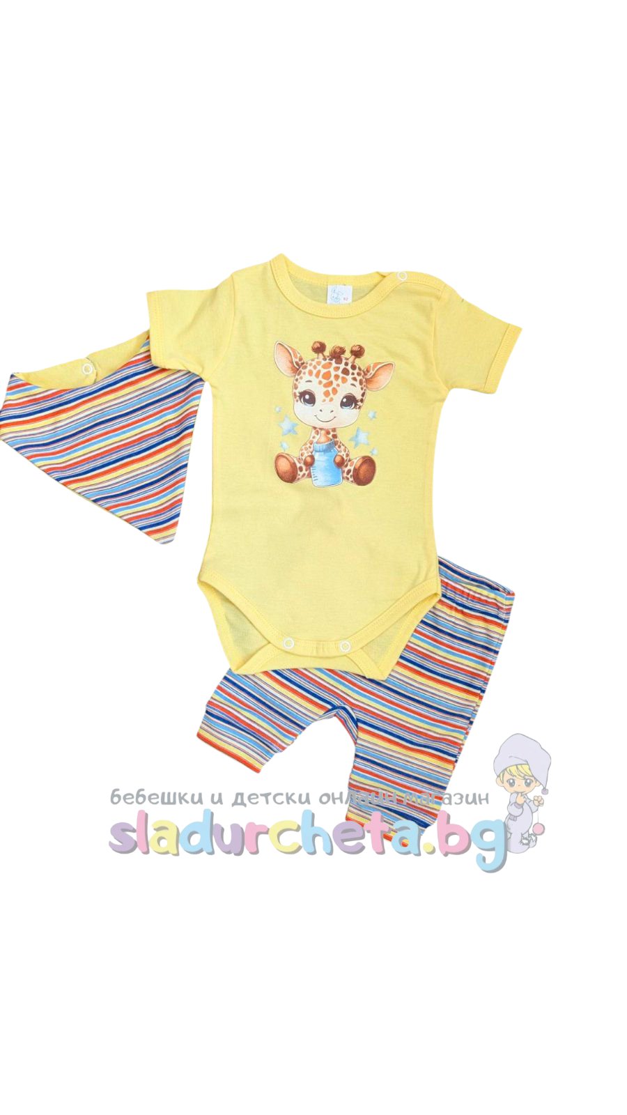 Бодито е в светло жълт цвят с цветна апликация на жирафче и тик-так закопчаване;