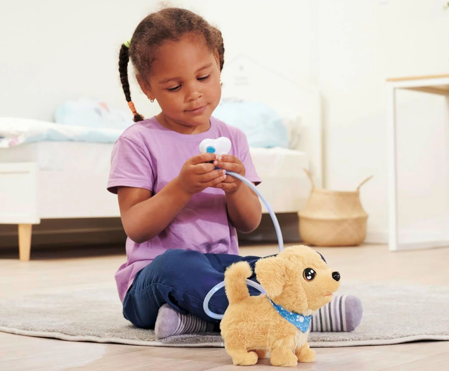 Акцентът на интерактивното кученце е неговият светещ повод за кучета (26 см), с който момичетата и момчетата могат да разхождат своята играчка за гушкане дори на тъмно;