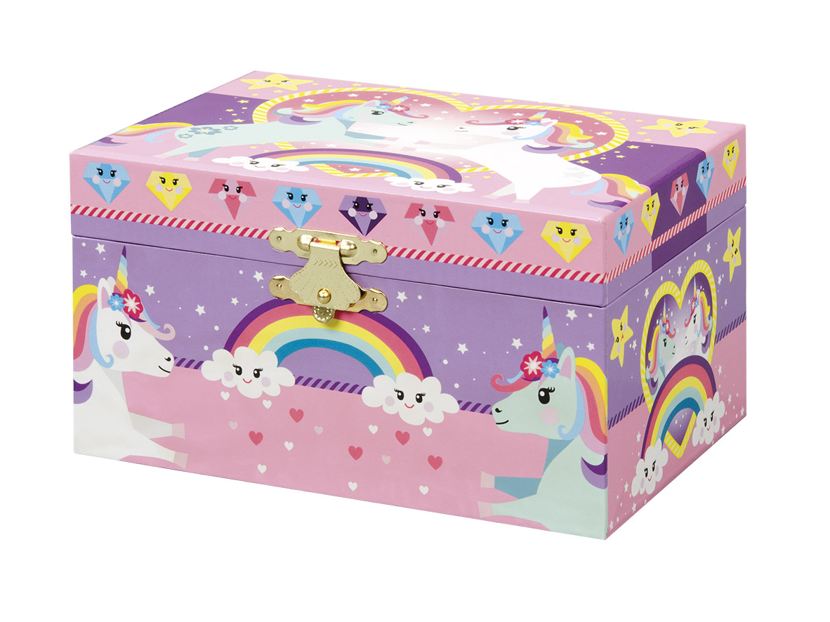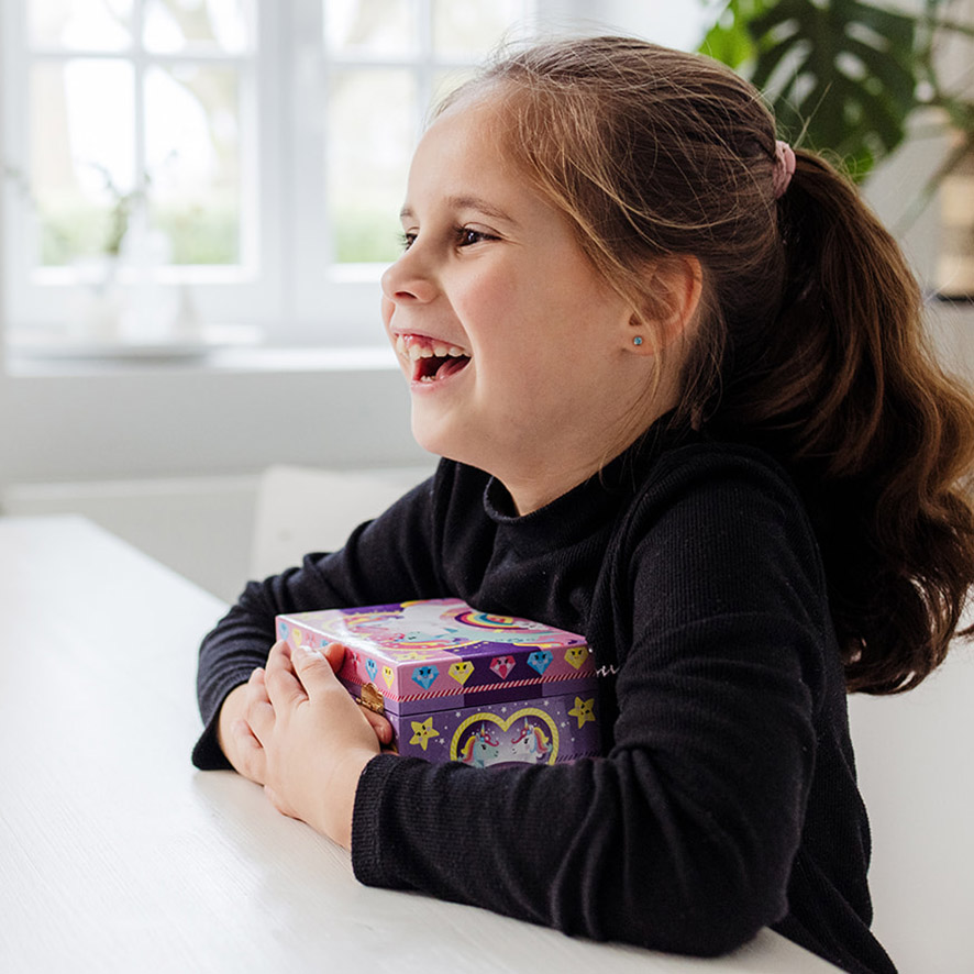 Отворете кутията, навийте ключето и наблюдавайте фигурата на любимия еднорог как се върти в ритъма на музиката;