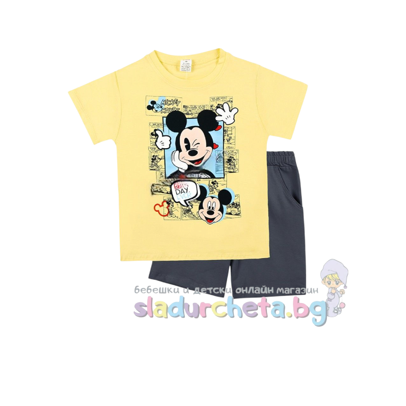 Тениската с къс ръкав в жълт цвят с цветна апликация на Мики Маус;
