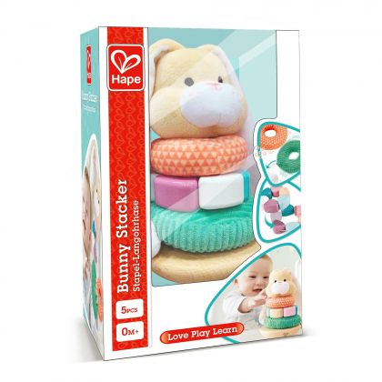 Многоцветната пирамида за нанизване Зайче ще достави радост на бебето по време на игра и ще му помогне да развие своята координация, тактилни умения, слух и логическо мислене;
