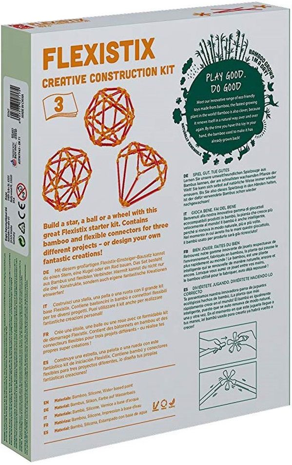 Творческият бамбуков конструктор е идеалният комплект за начално ниво за игра с Flexistix, с който децата могат лесно да се създадат форми като топка, звезда и колело;