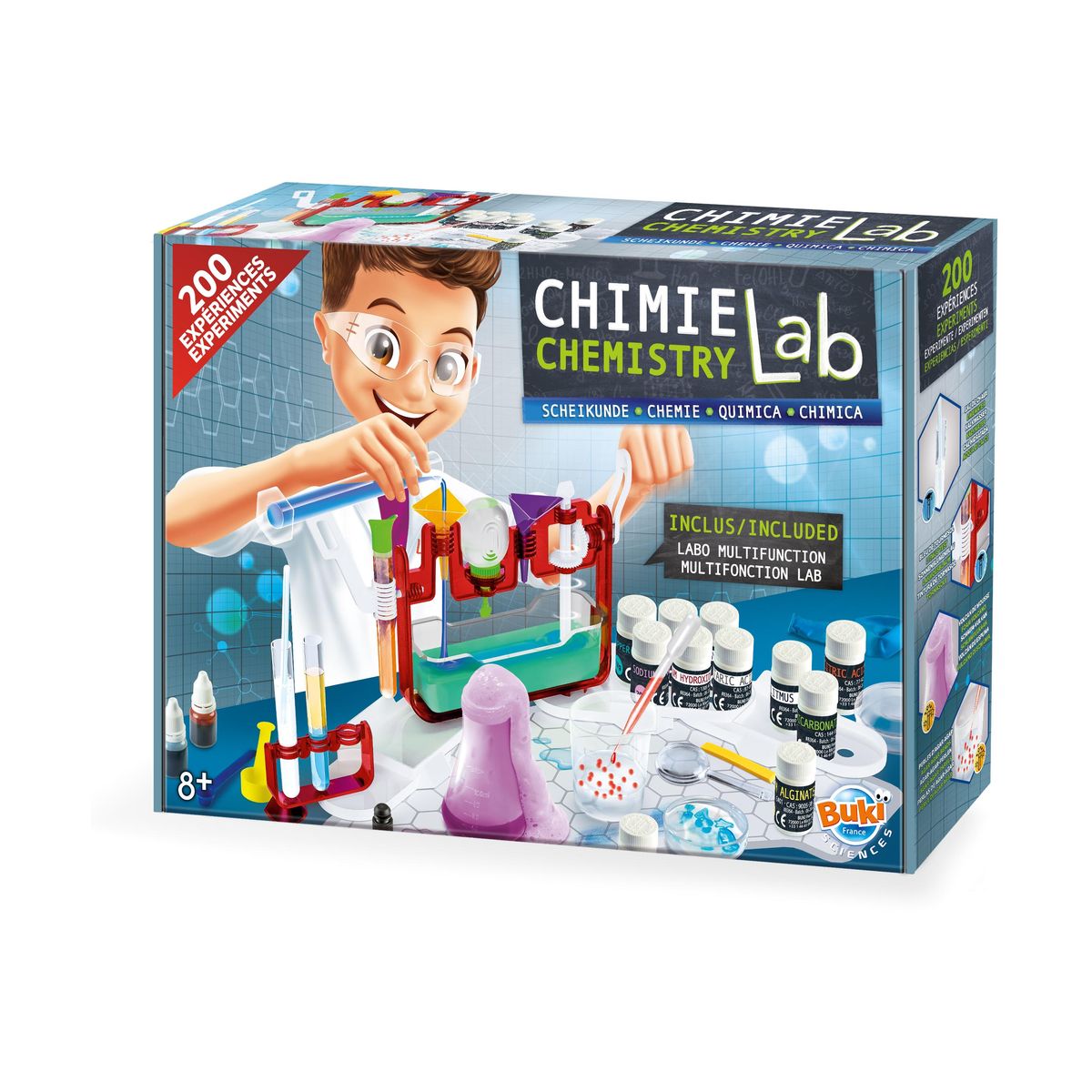 Комплектът включва изключително широка гама от лабораторни инструменти и безопасни, сертифицирани химически вещества, които децата могат да използват за извършване на различни химически реакции;