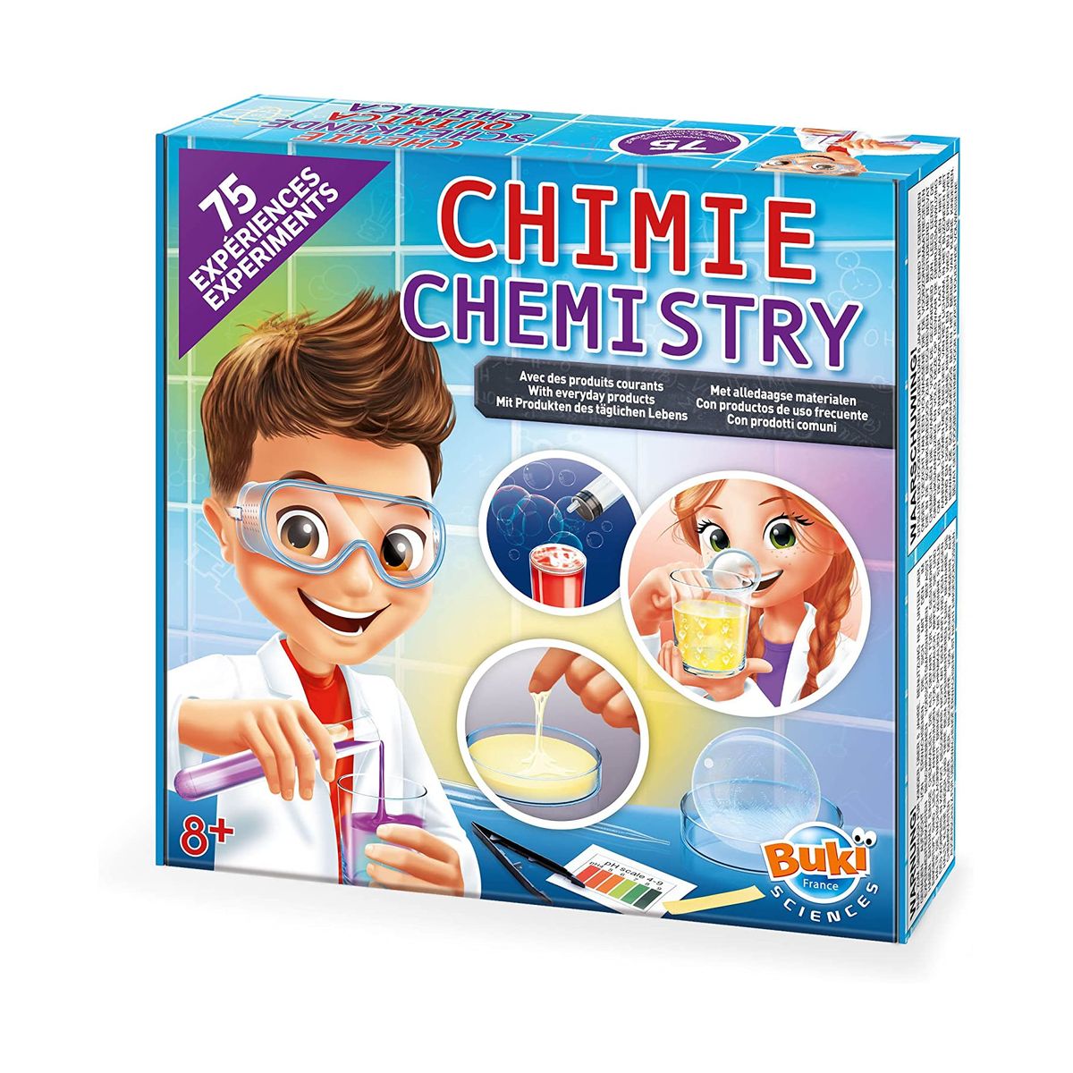 Комплектът включва изключително широка гама от лабораторни инструменти и безопасни, сертифицирани химически вещества, които децата могат да използват за извършване на различни химически реакции;