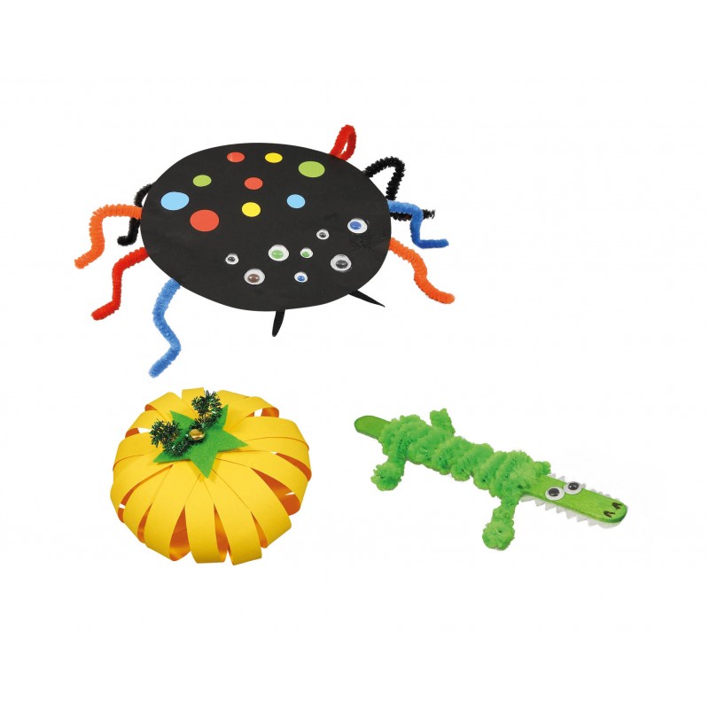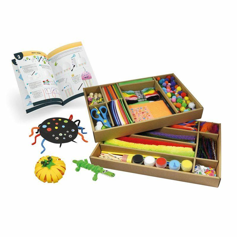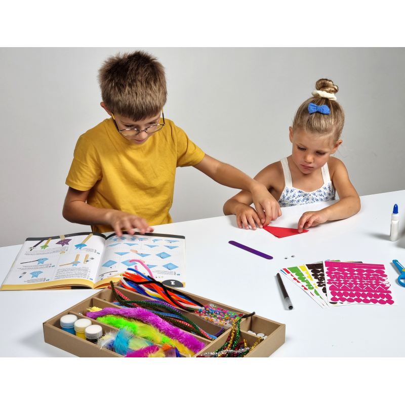 Включени: 1 перфоратор, 1 чифт ножици, 1 тубичка лепило, 1 игла, 1 черен флумастер, 1 четка за рисуване, 1 диамантен лист, 10 месингови закопчалки, 6 цвята памучен конец, 6 листа стикери, 6 сламки, 5 бр. буркани с боя, 5 щипки за дрехи, 2 ролки маскираща лента, 2 туби блестящо лепило, 30 пера, 25 копчета, 84 пластмасови очи, 100 почистващи препарати за тръби, 125 дървени пръчки, 38 листа филц, 5 листа гофрирана хартия, 35 бр. листове хартия, набор от дървени мъниста, асортимент от помпони, еластичен конец и 1 лист с инструкции;