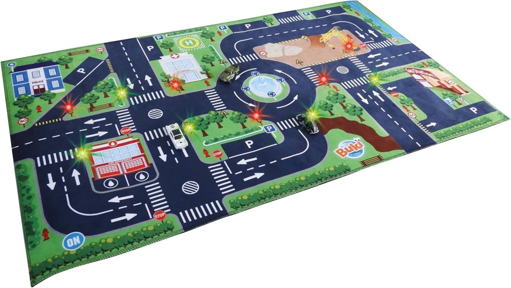Меко килимче е с нехлъзгаща се повърхност, включва светлини, които светят и променят цвета си, учейки децата на правилата на пътя;