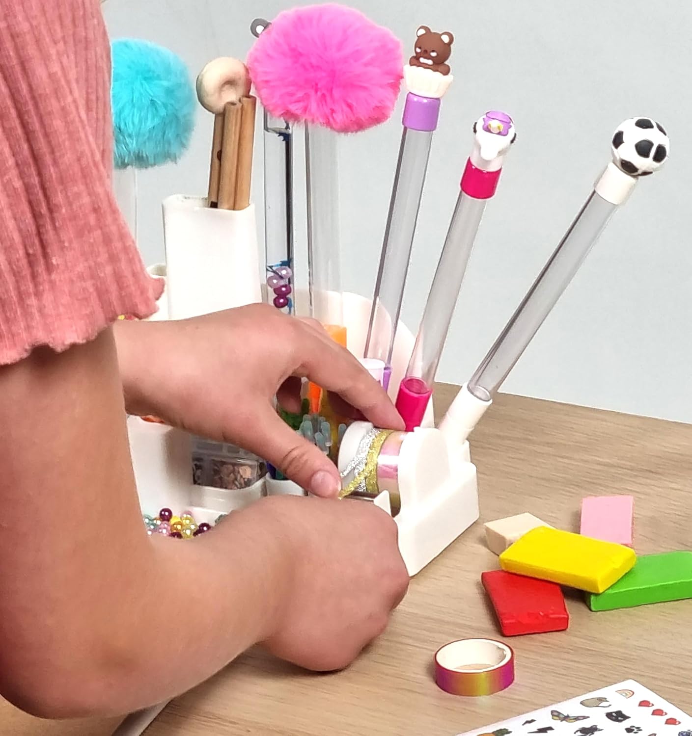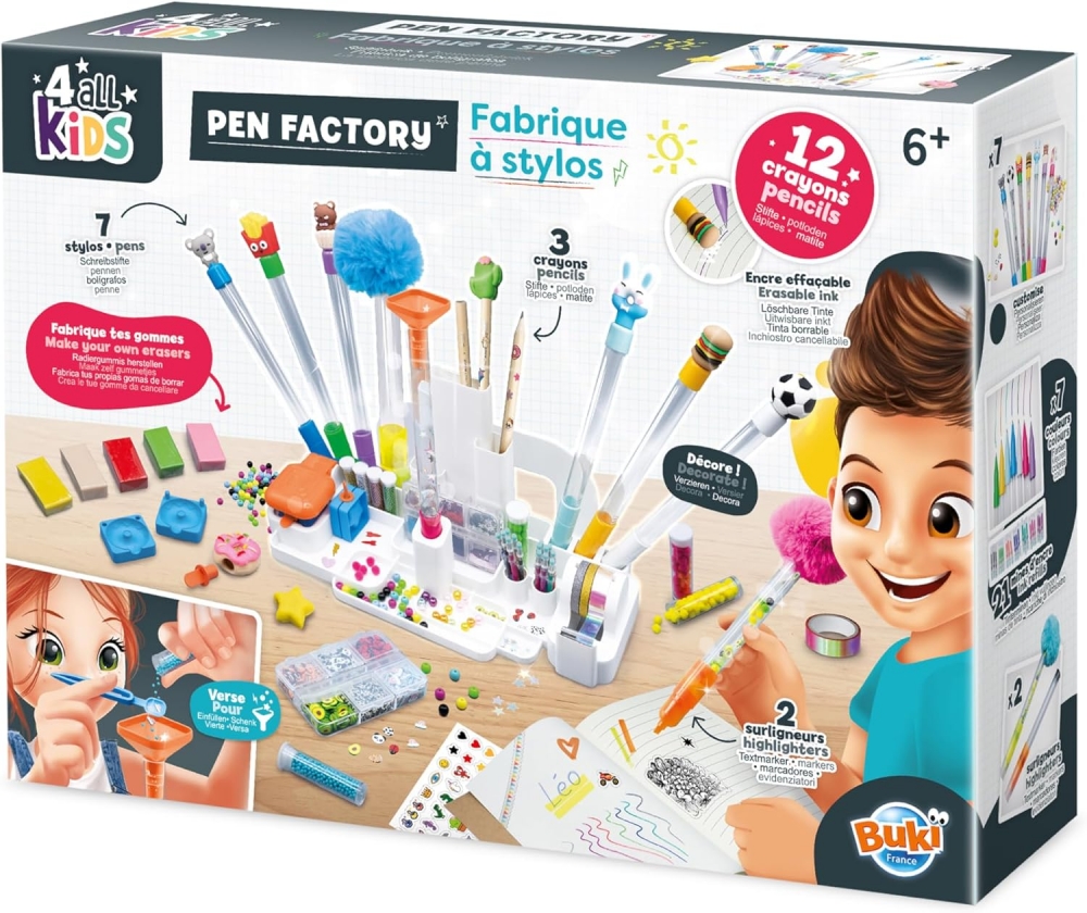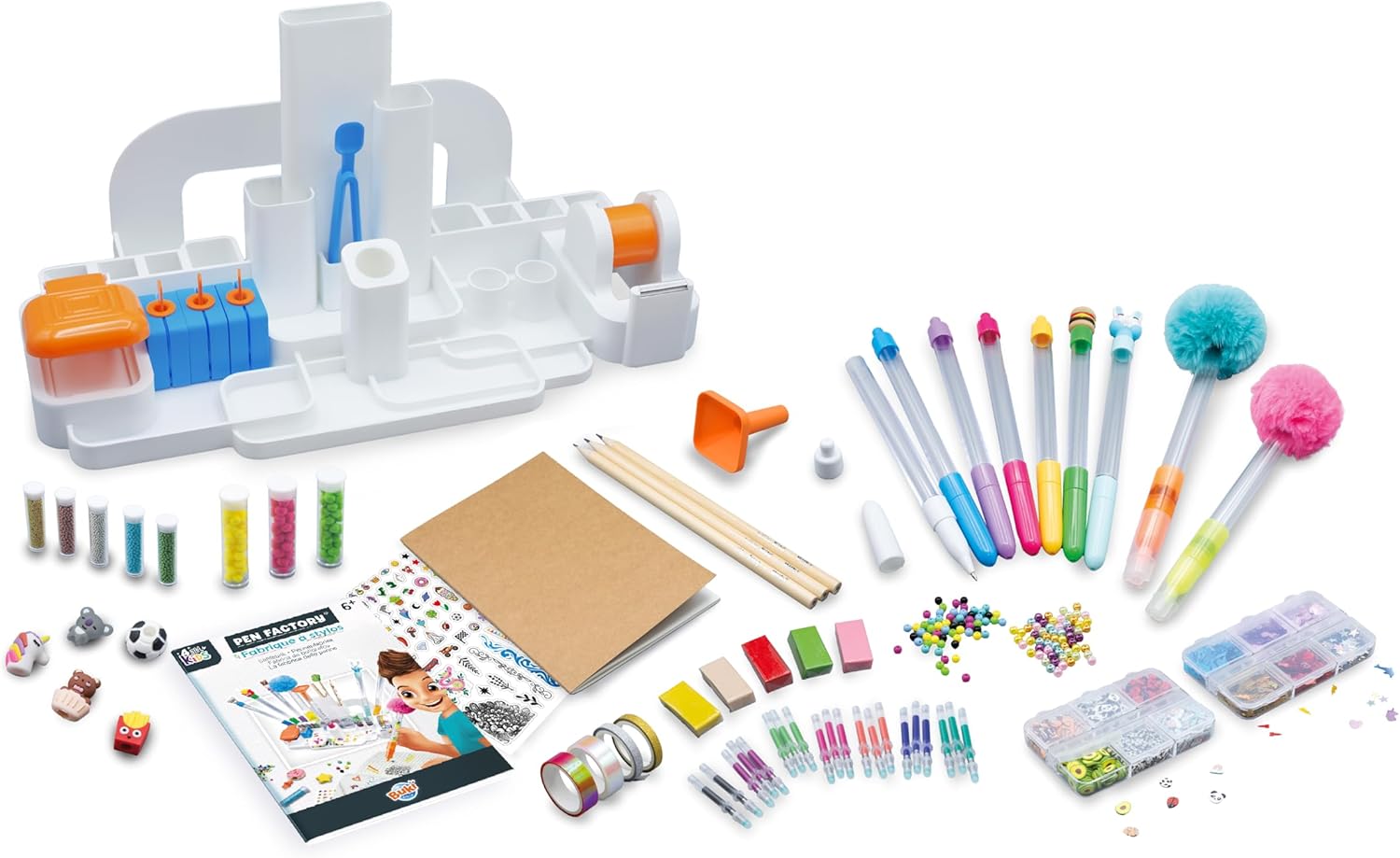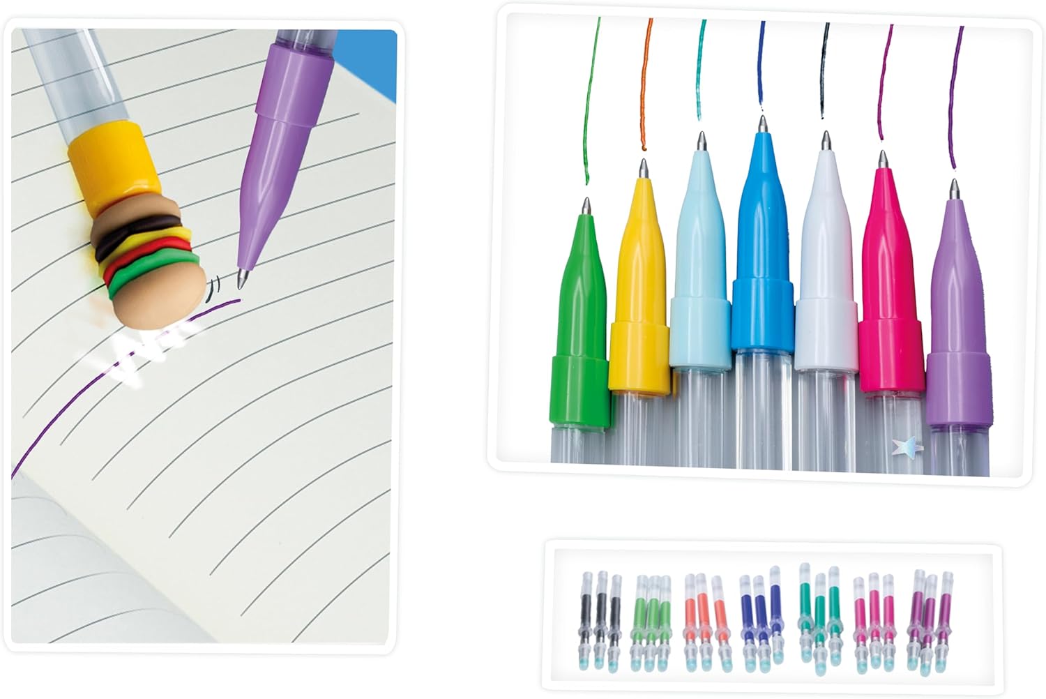 Съдържа: 7 химикалки, 21 пълнителя с изтриваемо мастило (7 различни цвята), 2 хайлайтъра, 3 молива, 1 тетрадка, 4 ролки тиксо, 1 лист стикери, 5 цвята глина за изтриване, 3 форми за изработка на гуми, 7 фигурки, 1 кутия пайети, 1 кутия цветна декорации, различни мъниста и декорации;