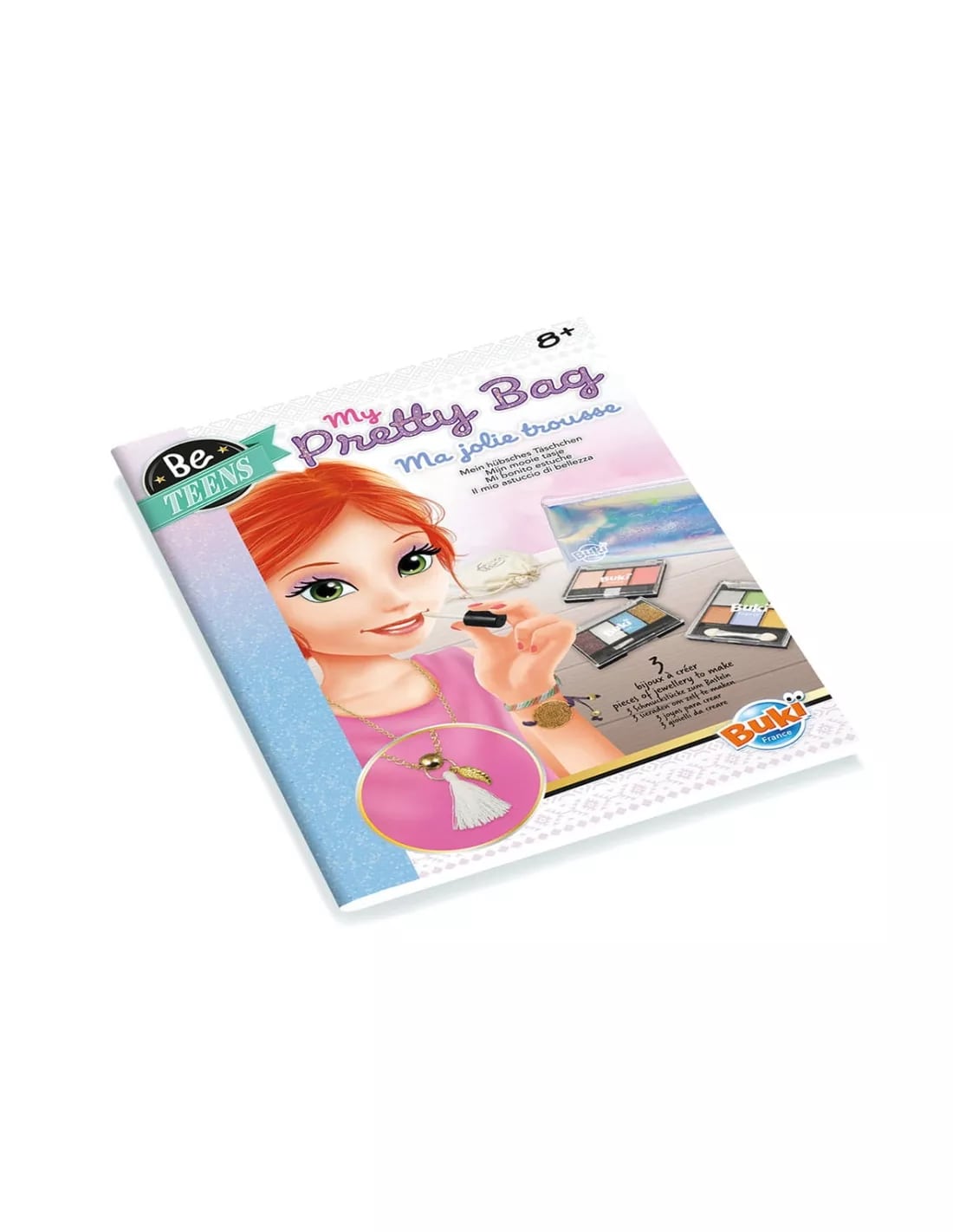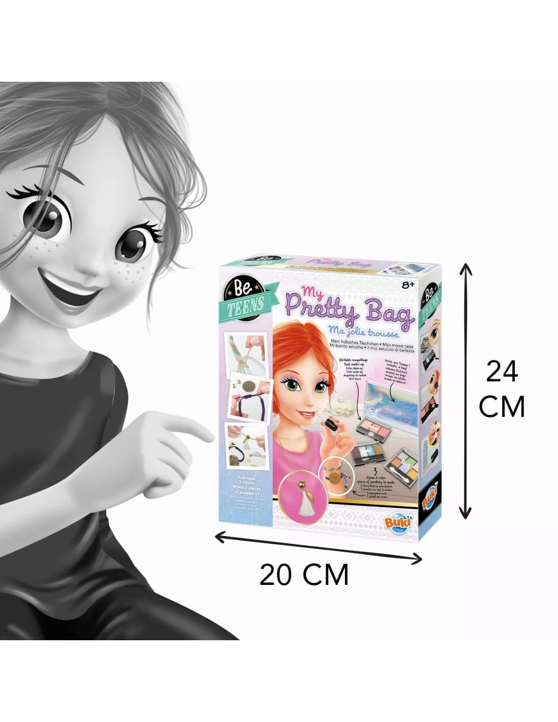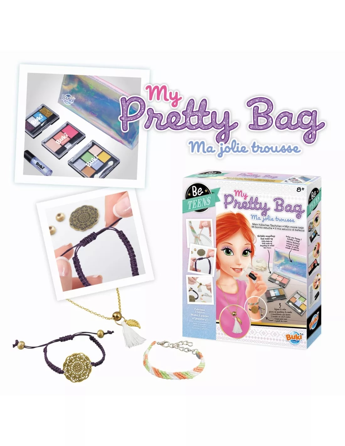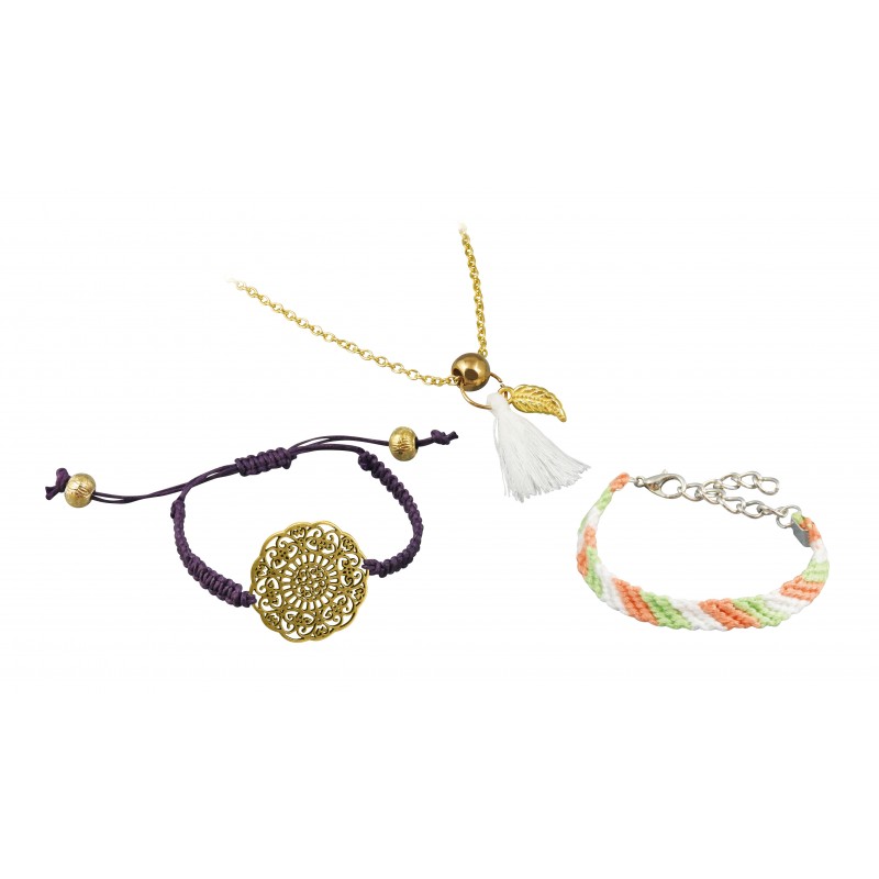 Комплектът включва: 1 чанта, 1 торбичка, 1 палитра сенки за очи, 1 блестяща палитра сенки за очи, 1 палитра руж, 1 гланц за устни, 3 големи златни мъниста, 1 талисман, 1 връзка, 1 помпон, 1 лилав шнур, 3 цвята памучен конец, 2 бр. кримпващи закопчалки, 2 закопчалки за нокът на омар, 3 верижки, 4 халки и 1 лист с инструкции с цветни илюстрации;