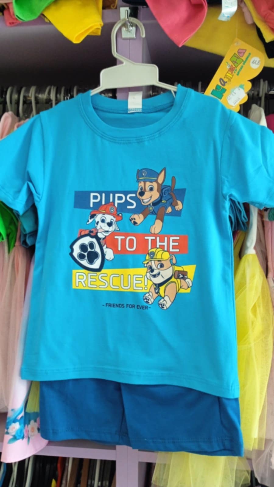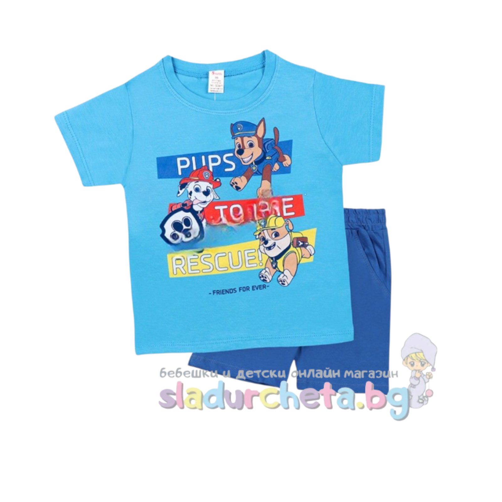 Тениската е с къс ръкав в син цвят с апликация на Пес Патрул;