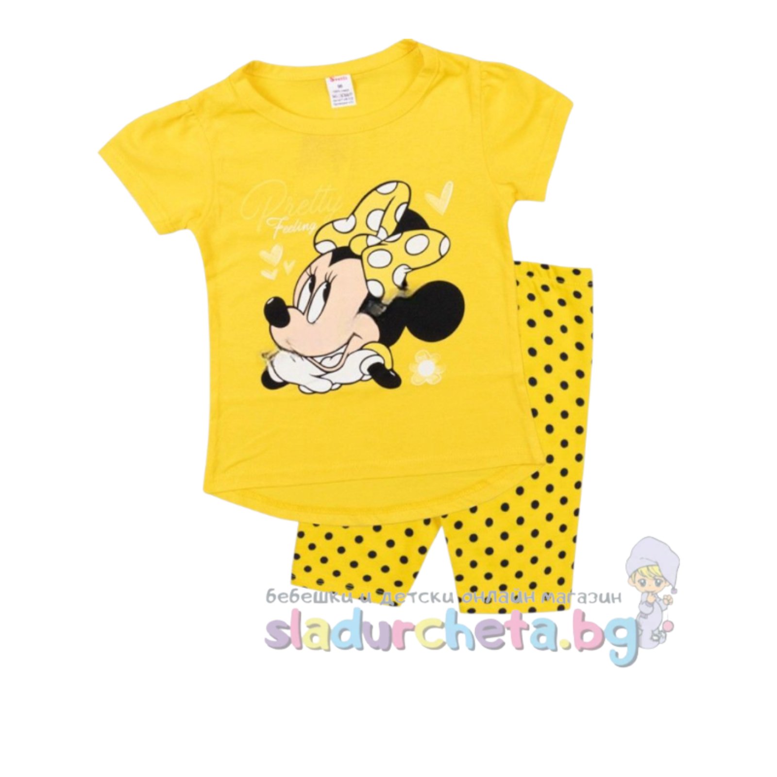 Тениската е в жълт цвят с цветна апликация на Мини Маус;