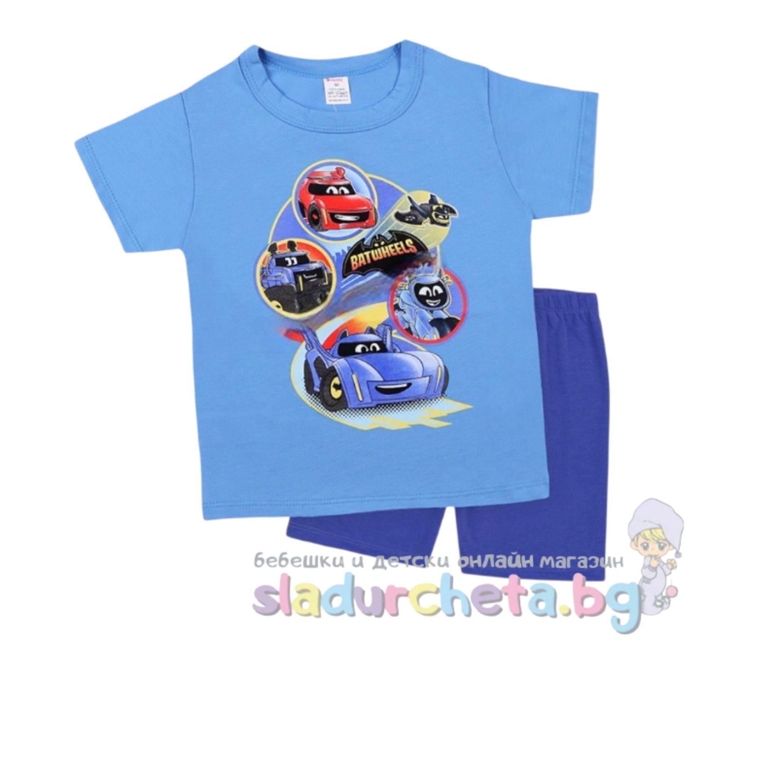 Тениската е в син цвят с цветна апликация на Бат-коли;
