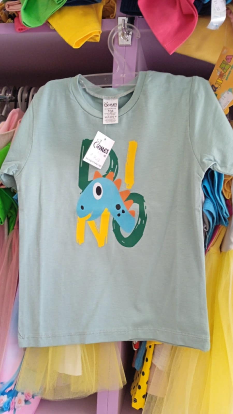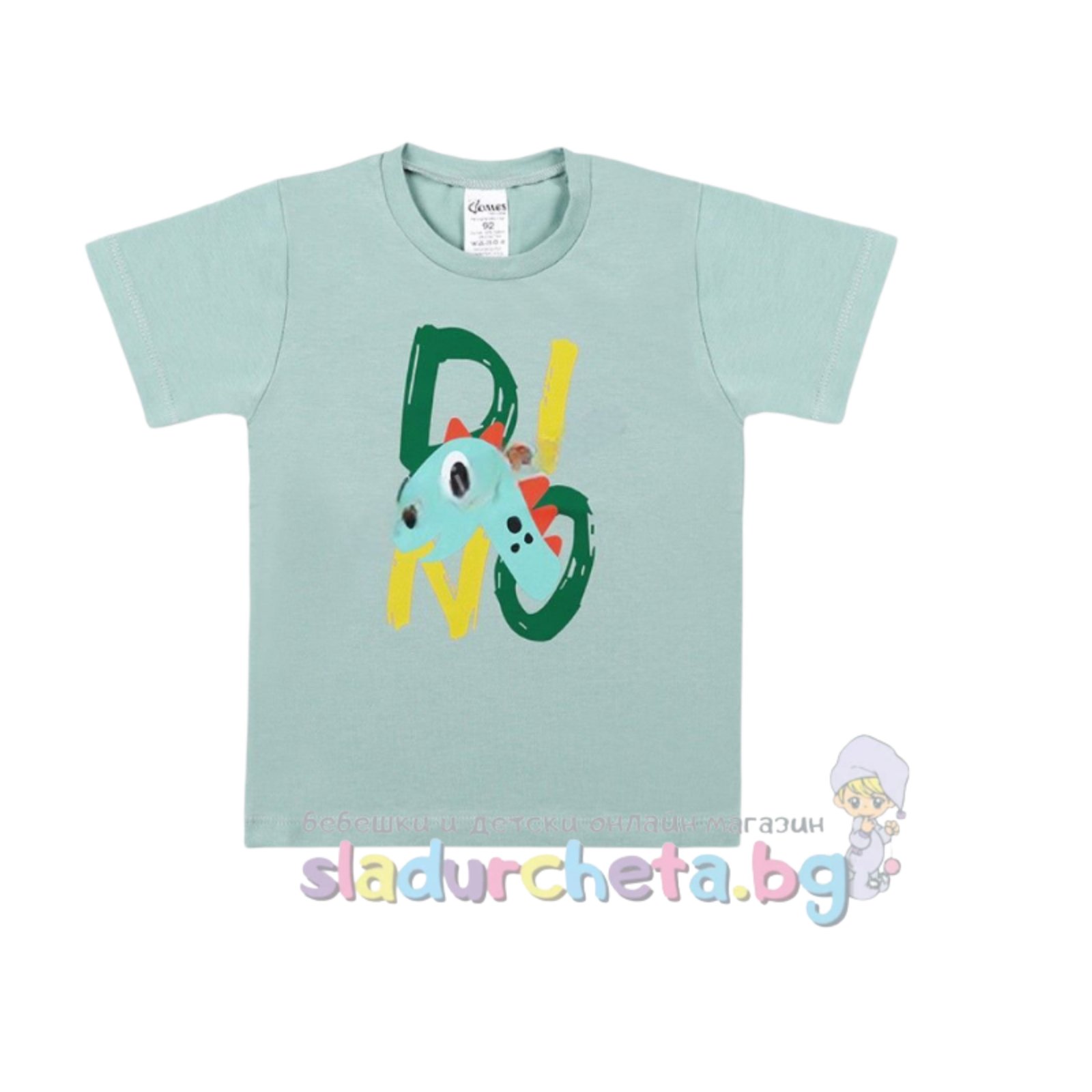 Тениската е с къс ръкав в цвят олив с цветна апликация на Дино;