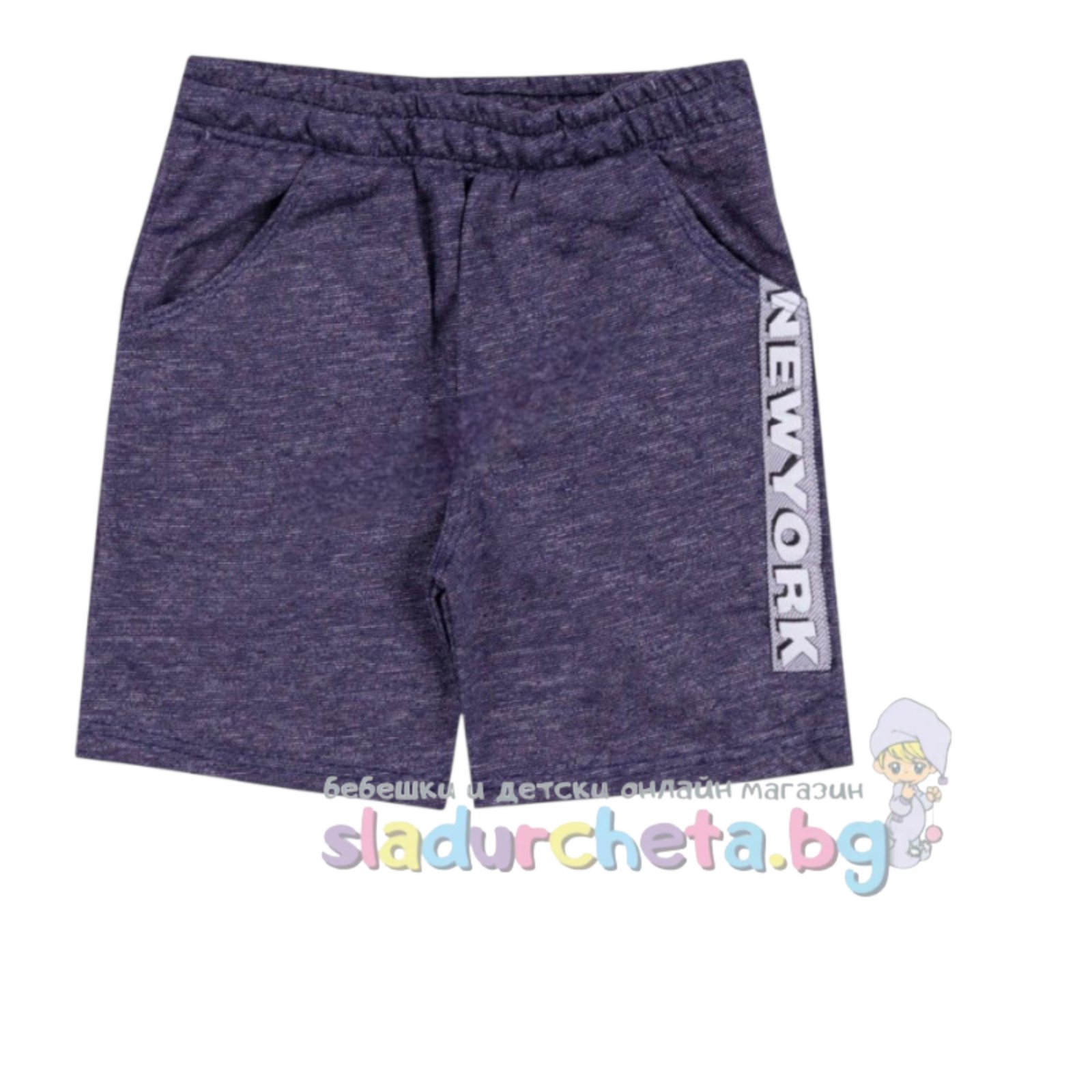 Късият панталон е с два джоба в цвят тъмносин меланж с ластична част на талията;