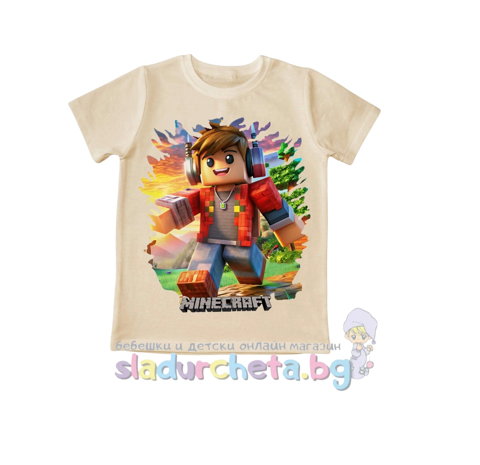 Тениската е с къси ръкави в бежов цвят с цветна апликация;