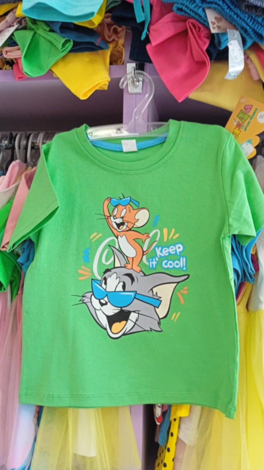 Тениската е с къси ръкави в зелен цвят с апликация на Том и Джери;