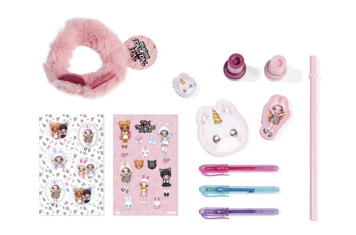 Комплектът включва: блестящи листове с различни стикери, тетрадка, гумички, лепящи бележки, химикалки с гел и блясък, печати и пухкаво скрънчи;