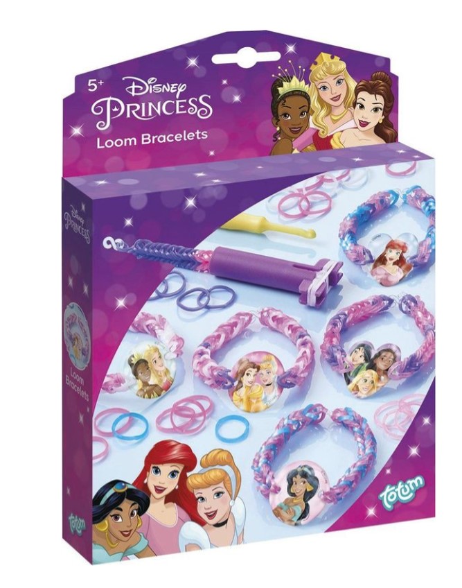 Занаятчийски комплект Disney Princess за изработка на 6 гривни от ластици с малък джобен стан за плетене, към всяка гривна може да се добави и талисмани на принцеса;