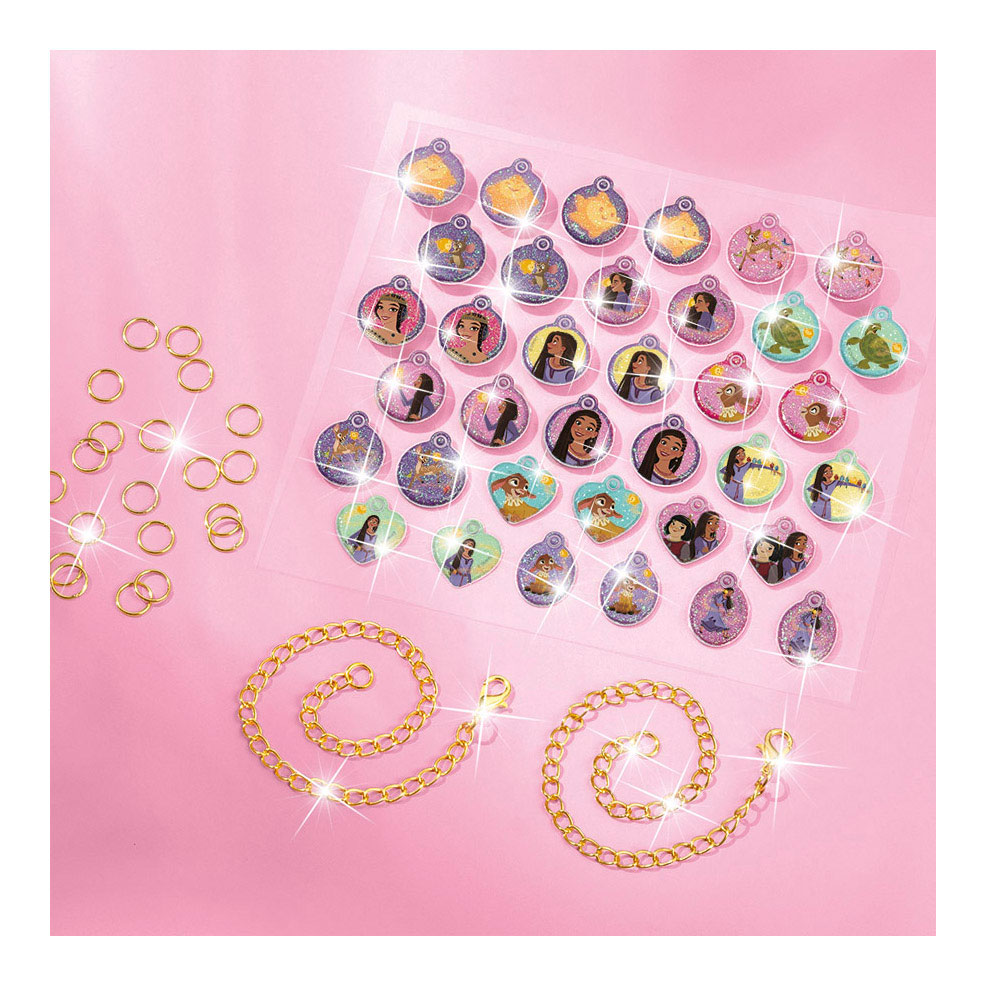 С този весел комплект бижута можете лесно да направите най-хубавите гривни в темата на последния филм на Дисни Wish с талисмани, направени от 3D релефни блестящи стикери;
