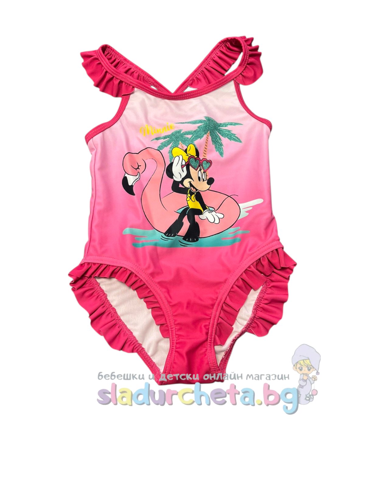 Банският е в розов цвят с апликация на Мини Маус и къдрави акценти;