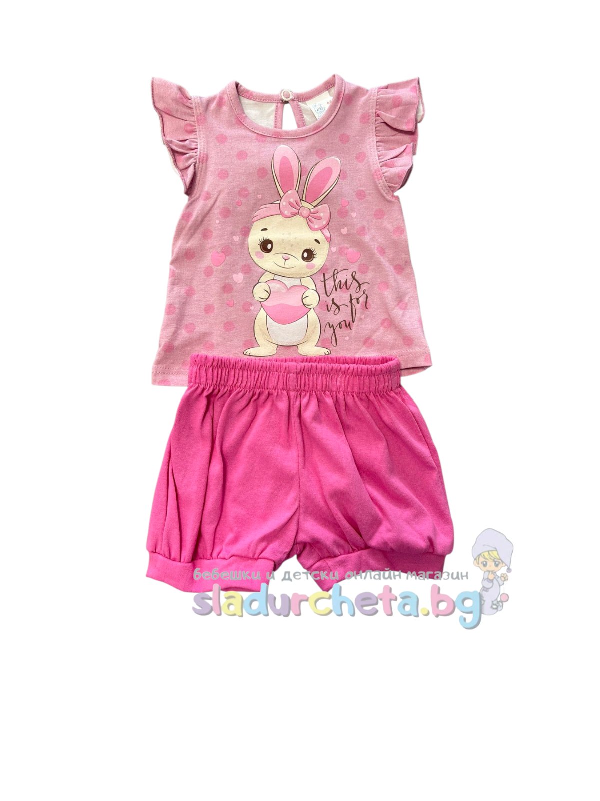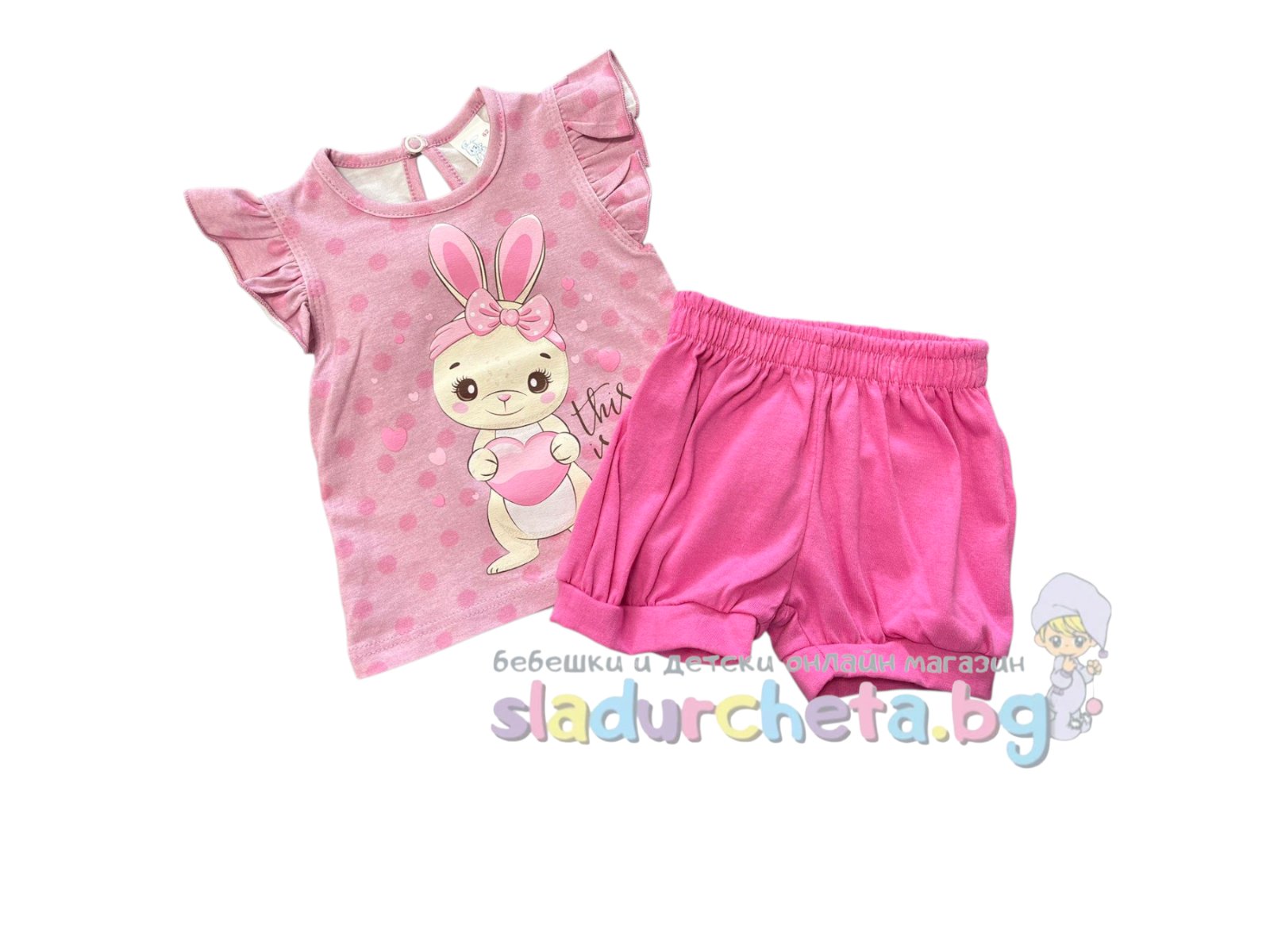 Тениската е с къс ръкав в розов цвят с апликация на зайче и къдрави акценти на ръкавите;