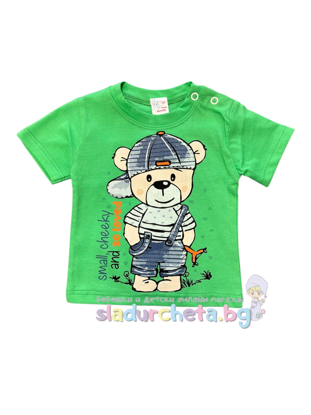 Тениската е с къс ръкав в зелен цвят с цветна апликация на мече;