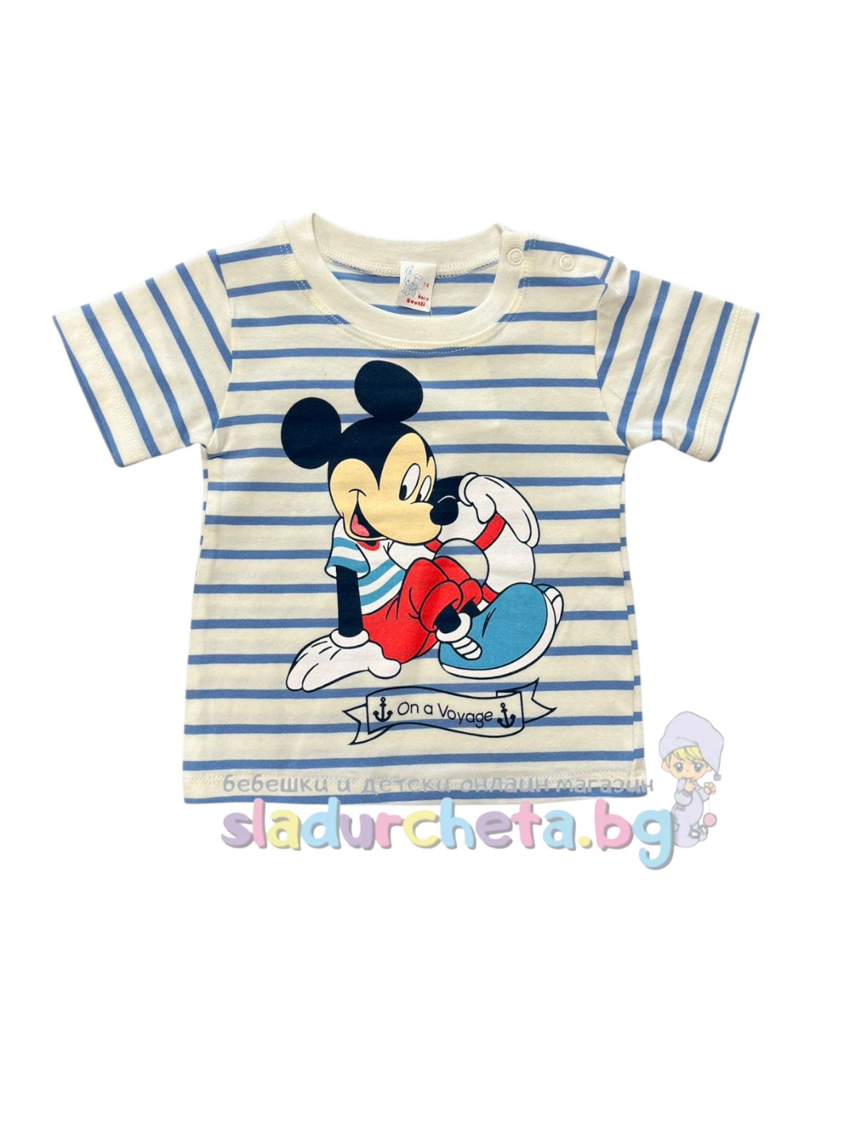Тениската е с къс ръкав в бели и сини райета с цветна апликация на Мики Маус;