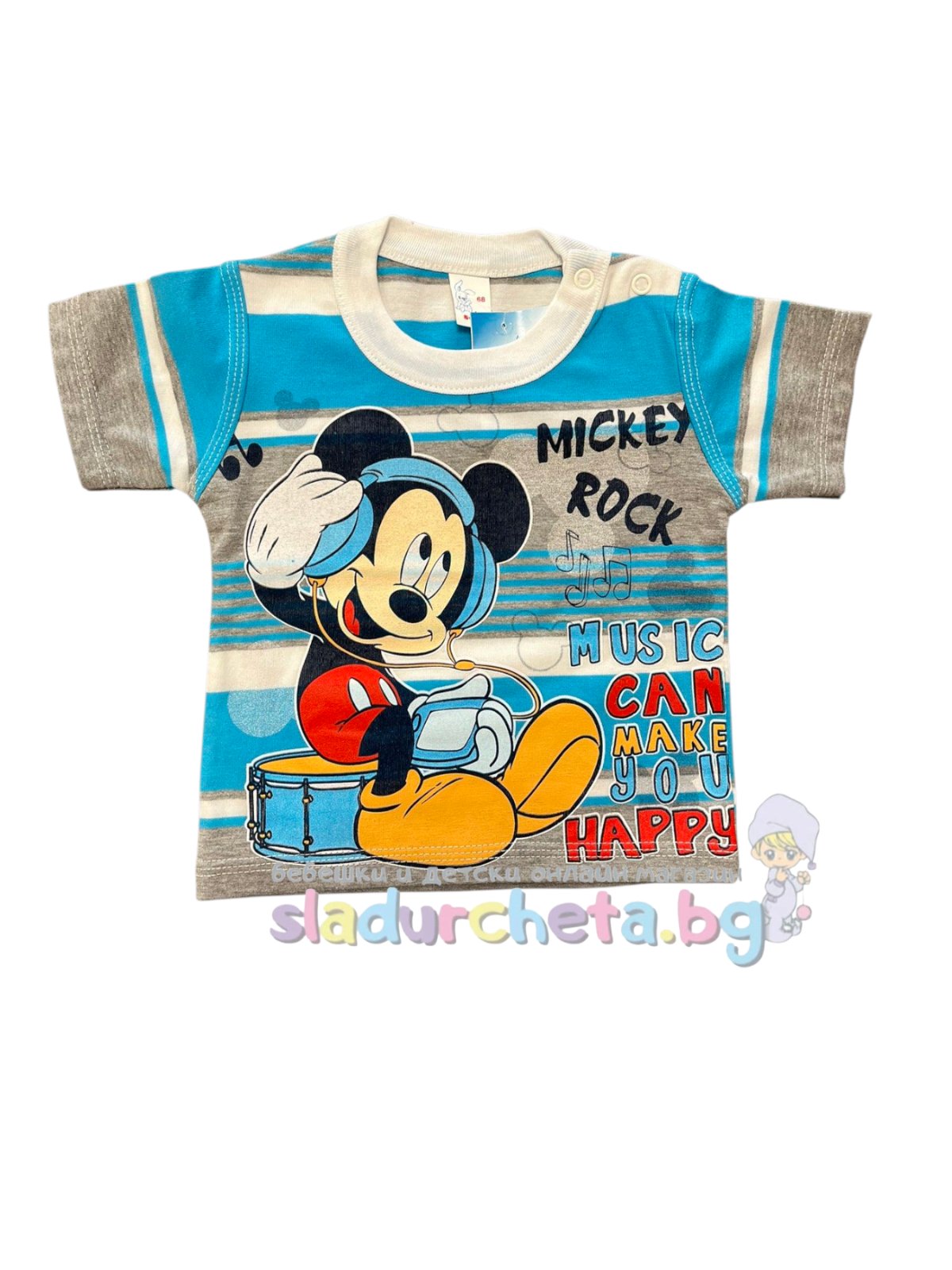 Тениската е с къс ръкав в син и сив цвят с цветна апликация на Мики Маус;