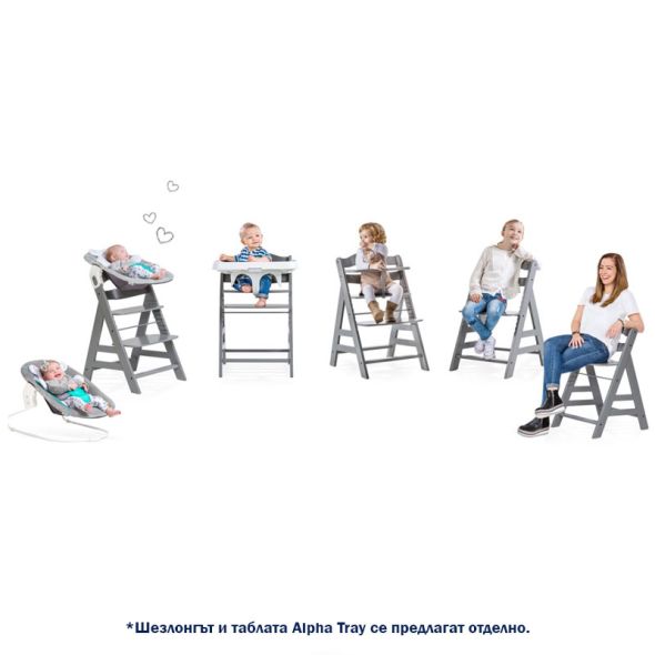 Имате възможност да го използвате от раждането на детето в комбинация с шезлонг Alpha /закупува се отделно/. По този начин бебчо ще може да "сяда" на масата заедно с цялото семейство, а вие ще можете да го наблюдавата по-лесно и удобно;