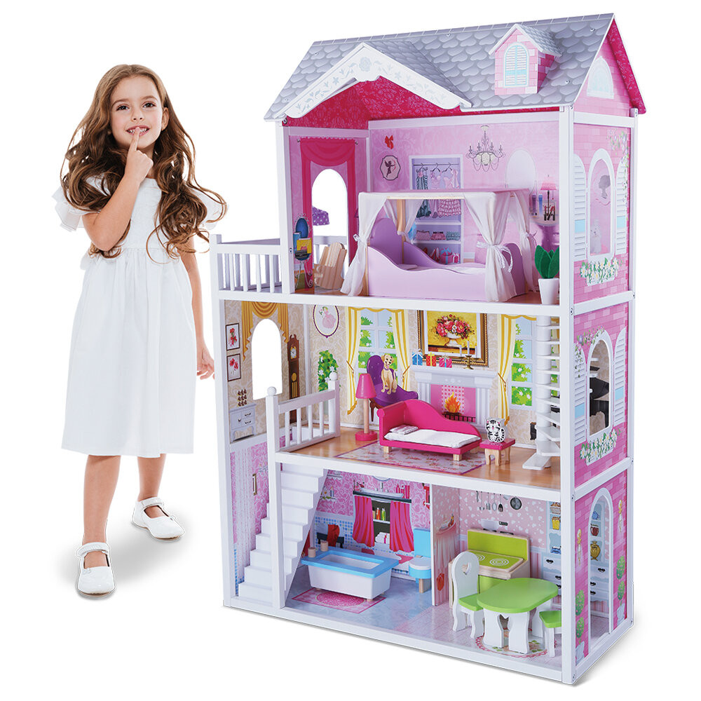 • Дървена къща за кукли, която включва и кукла в комплекта, заедно с 15 аксесоара и мебели за обзавеждане.