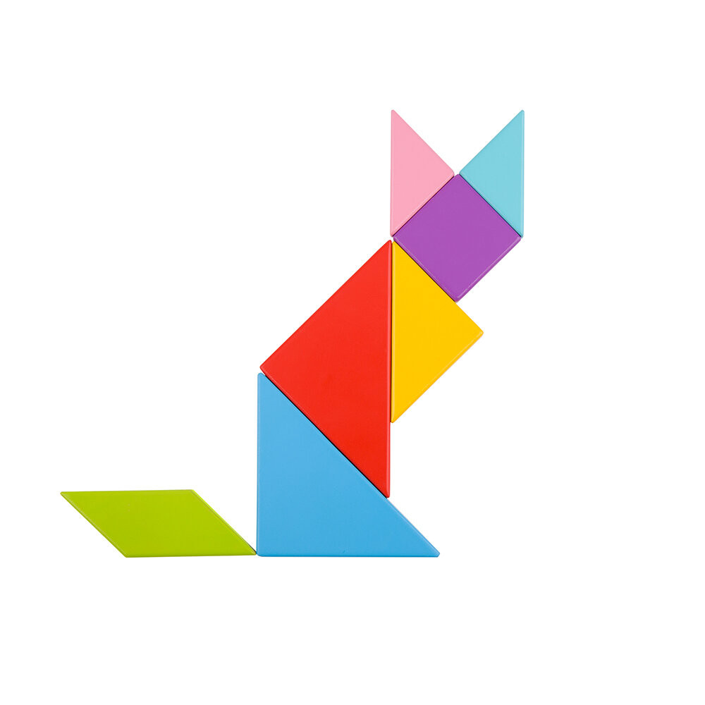 Танграм пъзел - игра от китайски произход със седем плоски геометрични форми предизвиква децата да създават най - оригиналните изображения с помощта на включените в комплекта шаблони и посредством доза въображение.