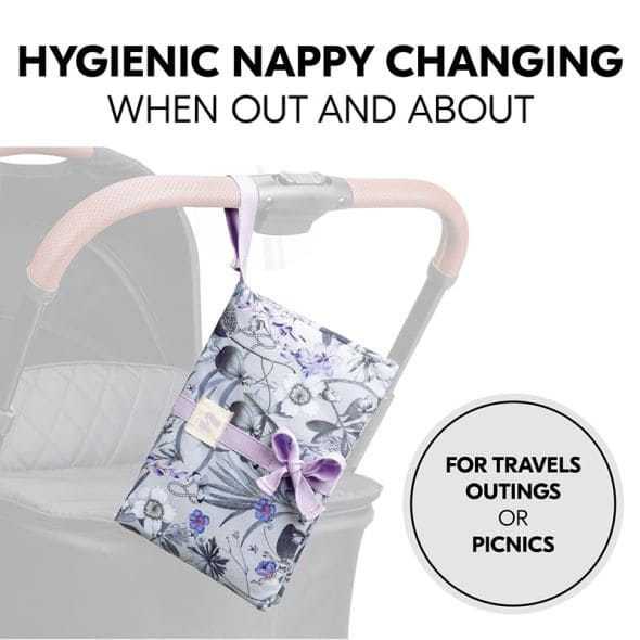 Малката чанта за пелени се предлага с практична подложка за повиване, която Ви позволява да сменяте пелените на Вашето бебе по хигиеничен и удобен начин по време на разходки, излети или пикници;