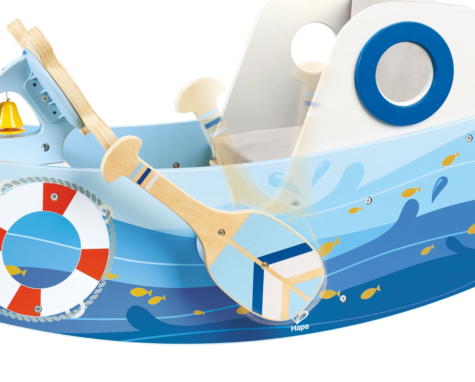 Украсена с красиви морски мотиви, лодката служи като визуално стимулиращо платно, вдъхновяващо въображението и креативността по време на игра. Воланът издава реалистичен тракащ шум, а звънецът звъни;
