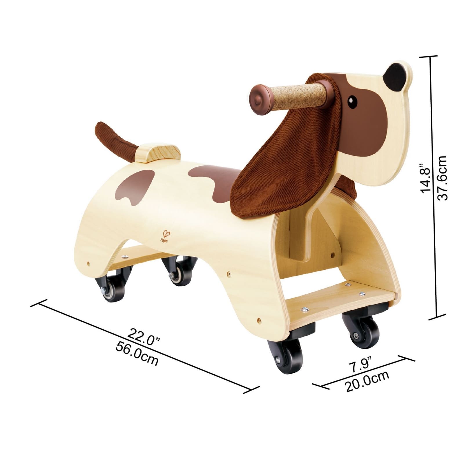 Това кученце се предлага с меки коркови дръжки, текстурирани кадифени уши и две предни колела, които могат да се въртят на 360°, за да можете да карате във всяка посока;