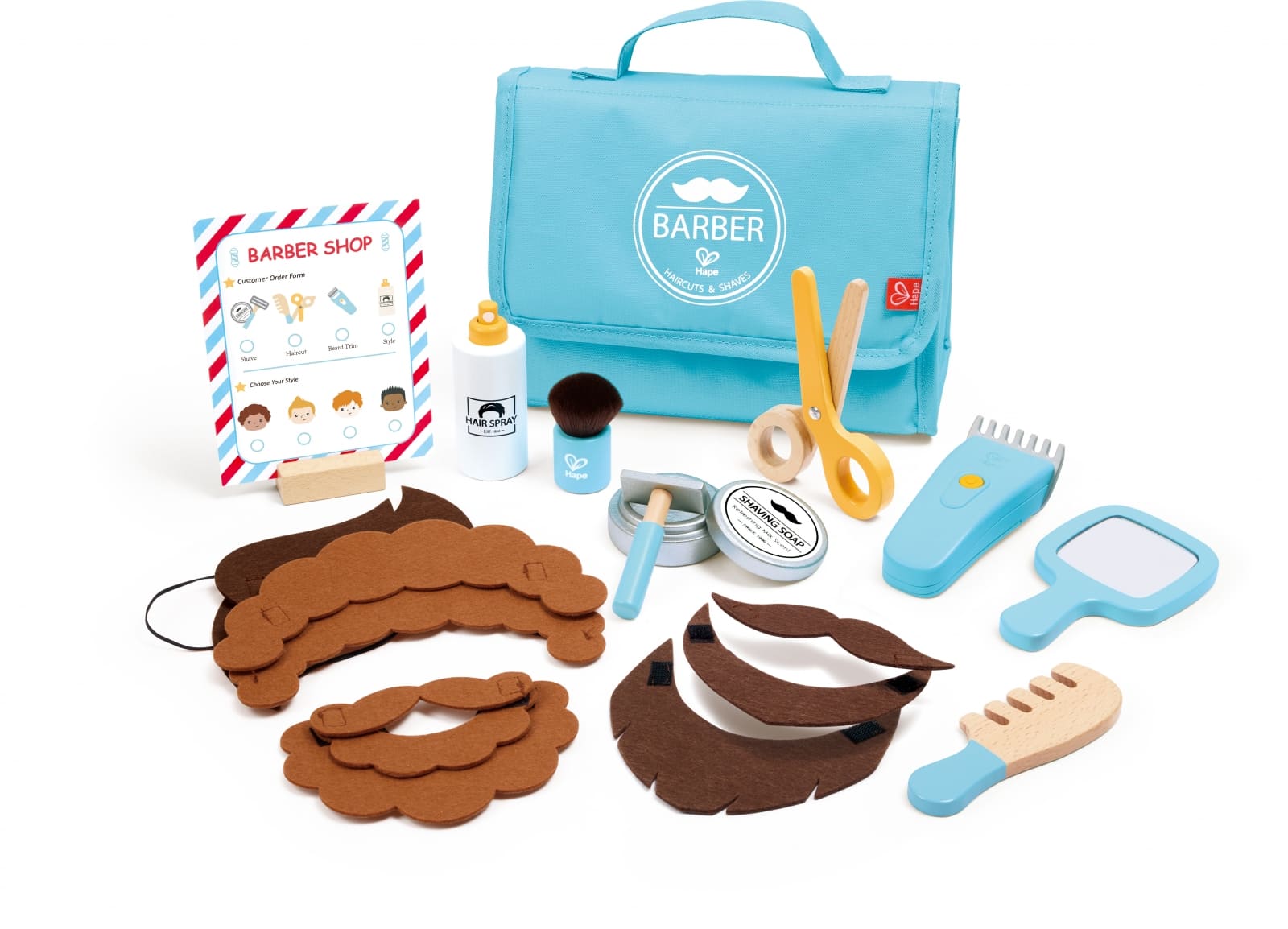 С реалистични инструменти като електрическа машинка за подстригване със звукови ефекти, самобръсначка, гребен, ножица, огледало, четка, кутия за сапун, спрей за коса, този комплект вдъхновява креативността и въображаемата ролева игра;