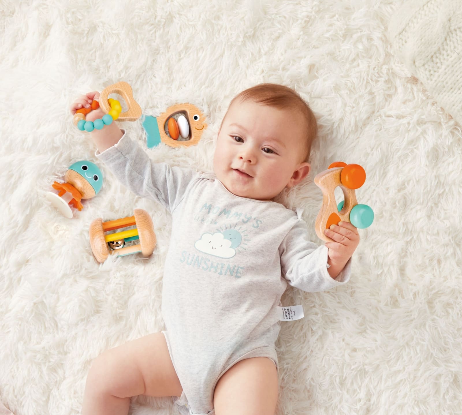 Дрънкалката и гризалката са перфектни за новородени, дрънкалката със стабилно положение е страхотна, докато седят в столчето за хранене, а търкалящото се кученце и дрънкалката ще насърчат пълзенето;