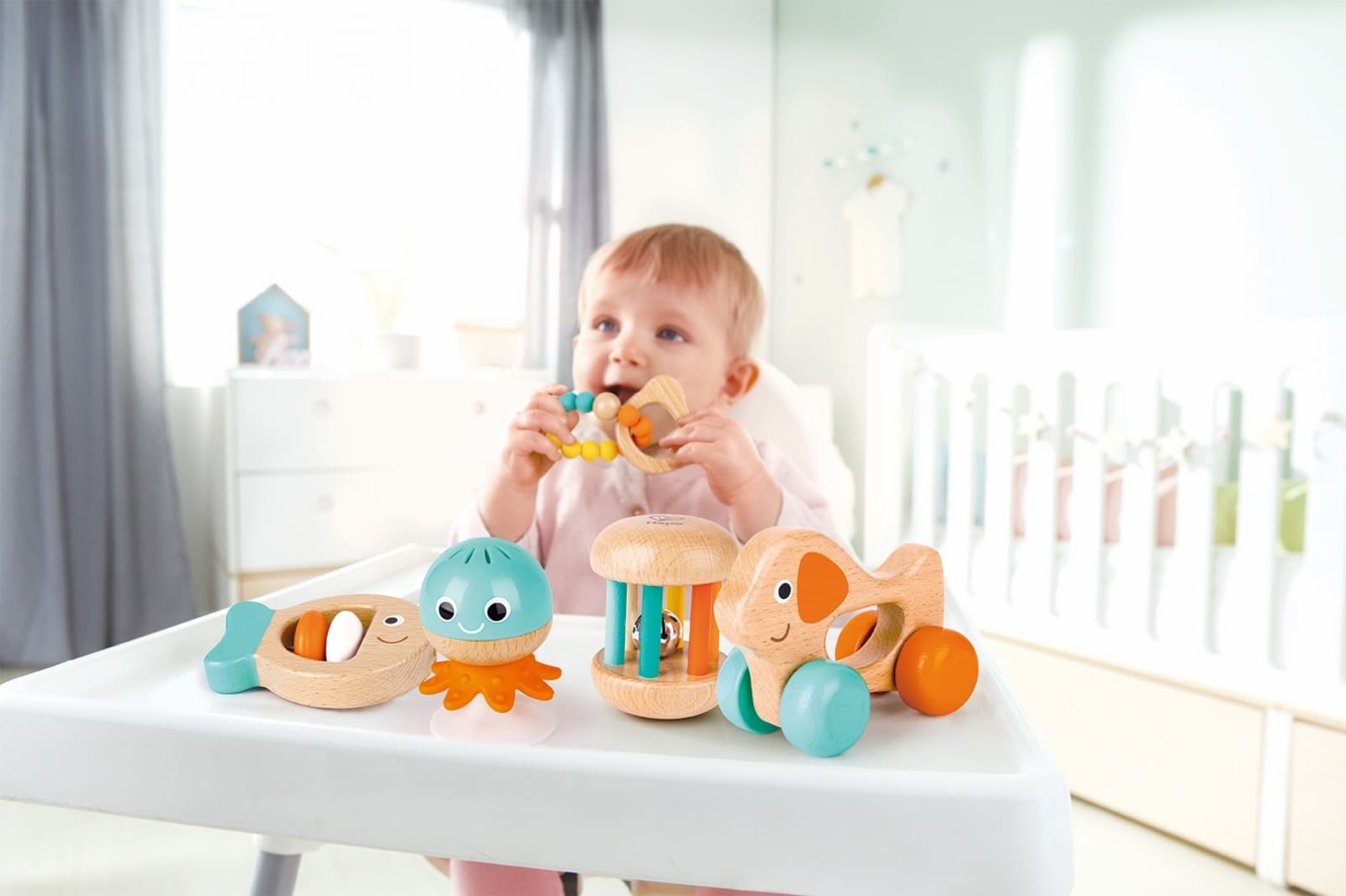 Бебетата ще харесат избраните играчки в естествени дървесни, сини и розови цветове;