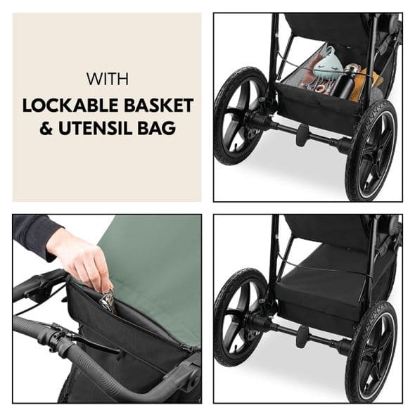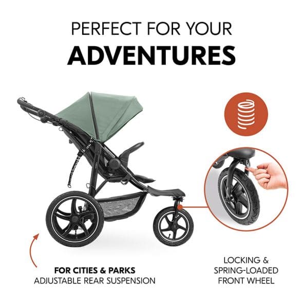 • 3 пневматични колела с окачване за всякакви терени, с двойно регулируемо задно окачване и заключващо се предно колело;