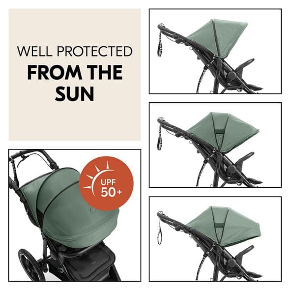 • Големият сенник със сгъваема козирка ще защити вашето дете (UV защита 50+) като можете дори да удължите сенника с помощта на ципа.