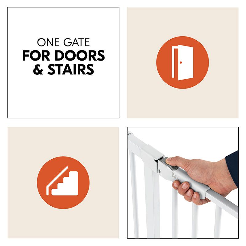 • Преградата Clear Step Autoclose 2 е предвидена да покрива отвори между 75-80 см, но с отделно предлагани удължения тя може да се използва и за по-големи до 122 см. Като използвате отделно предлаганите Y шпиндели, можете да монтирате преградата и на стълбища с кръгли пръти;
