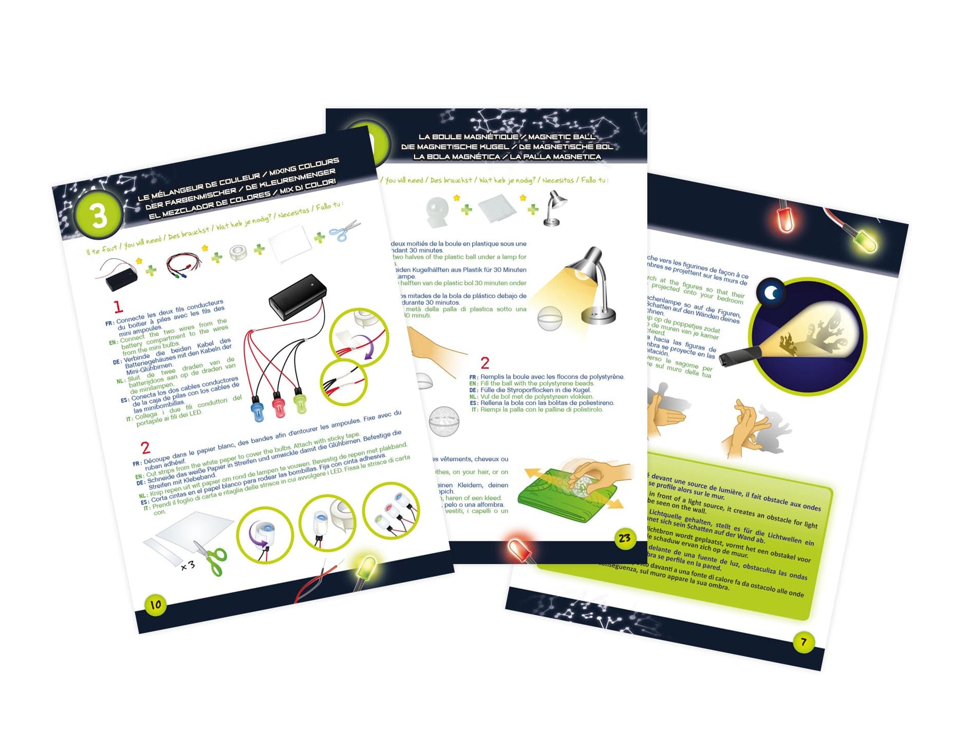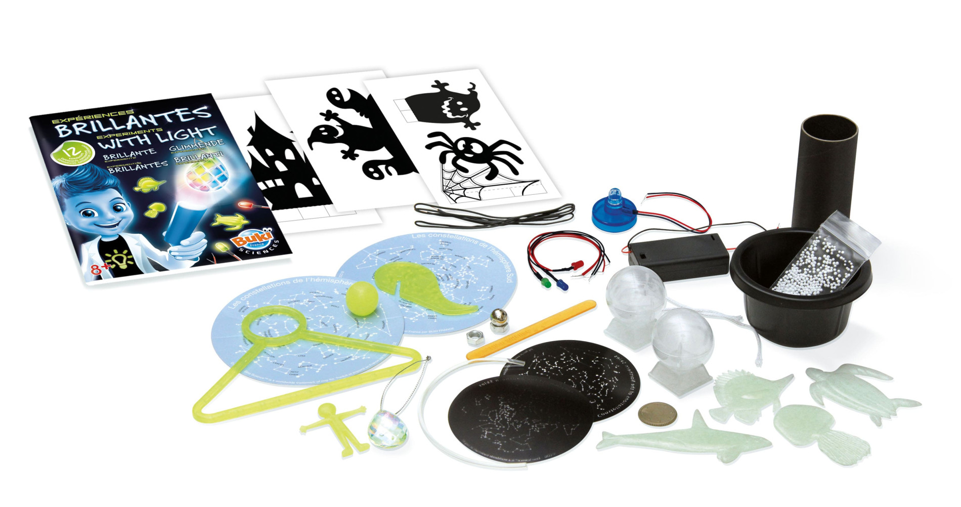 Комплект за деца, който съдържа 12 изненадващи и иновативни експерименти, които трябва да бъдат направени на тъмно, така те ще разкрият магията на светлината, силата на цветовете и сенките;