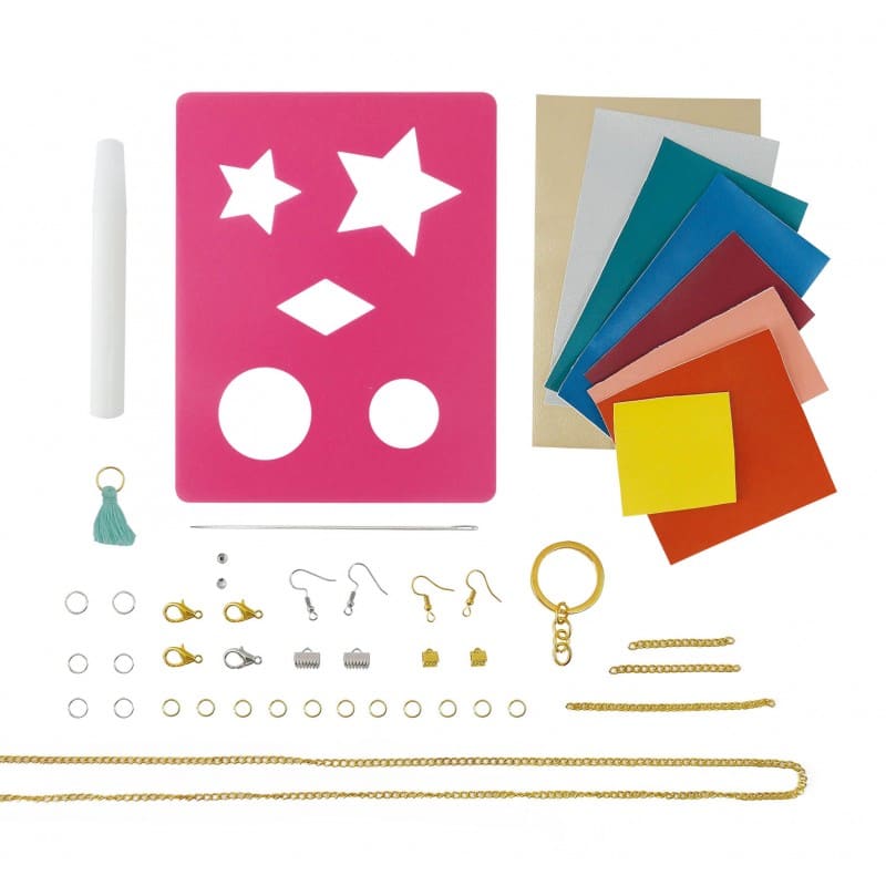 Създайте 6 цветни бижута от имитация на кожа, които ще изрежете и сглобите, за да ги превърнете в гривни, висулки или ключодържатели;
