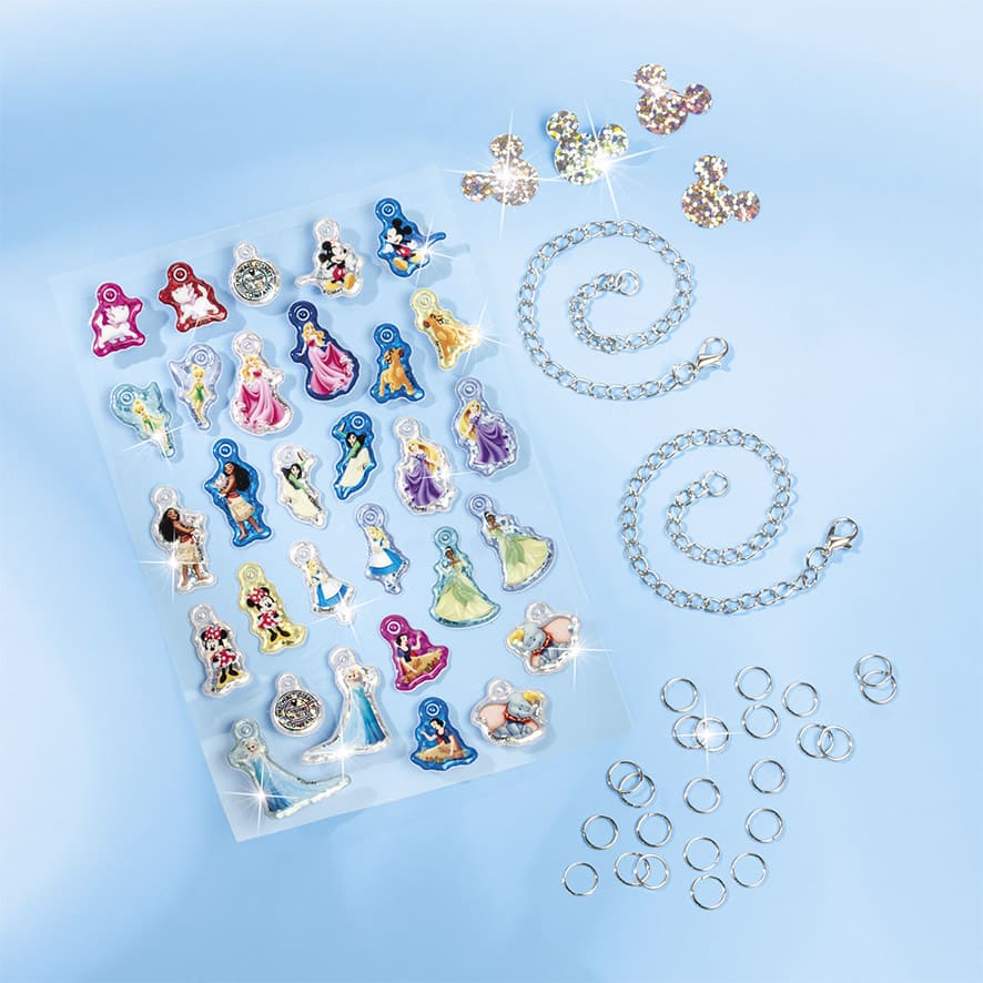 • Направете 2 красиви талисмани с любимите си герои, като използвате 2D блестящи стикери и украсете 6 карти с герои на Дисни с диаманти;